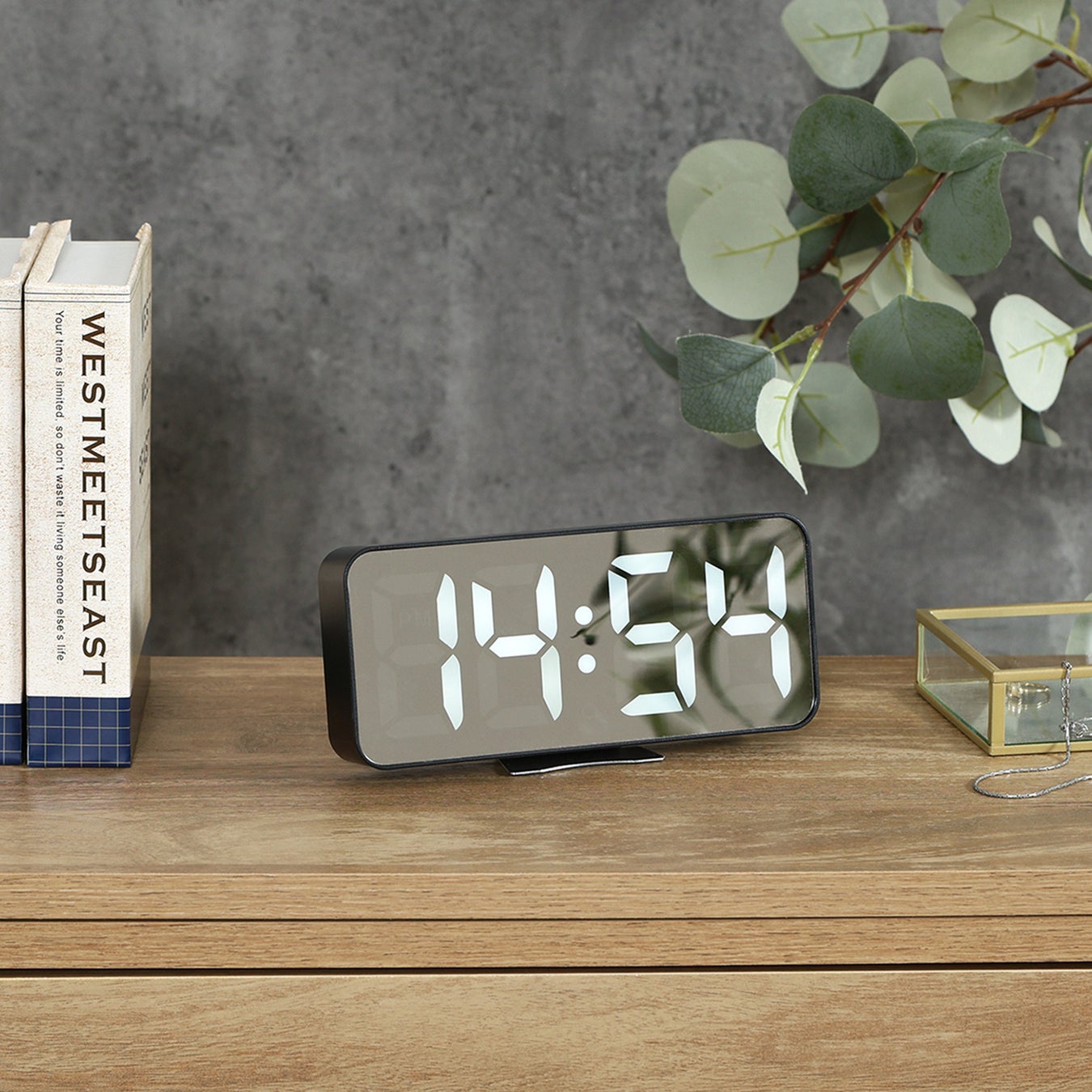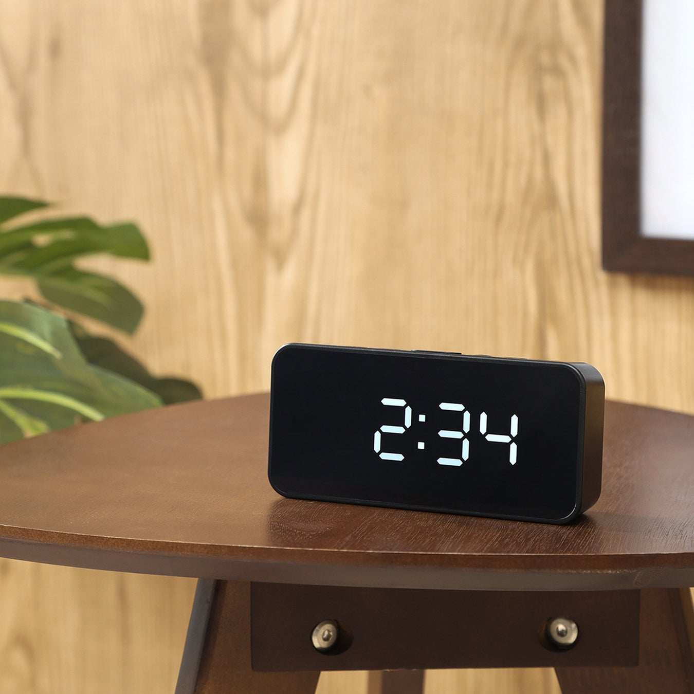 ミラー仕様のディスプレイが印象的な、スタイリッシュなデザイン。大きく見やすい表示で、時間表示を消す「夜間モード」と温度を表示する「温度モード」の切り替えにも対応しています。