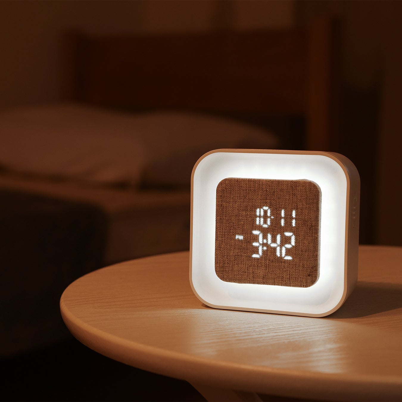 ファブリック素材に文字が浮かび上がる、インテリア性の高いデザイン。表示の明るさは調整可能で、暗い部屋でも眩しくなく、就寝前の使用にも最適です。