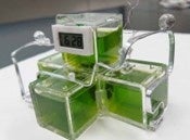 植物の葉緑体に含まれるチラコイド膜から「光化学系Ⅱ複合体(PSⅡ)」のみを抽出し、光合成によって酸素、水素イオン、電子を生成させ、光エネルギーを電気エネルギーに変換。再生可能かつ環境調和型素材による新しい光バイオ燃料電池です。3センチメートル角のPSⅡ溶液を入れたキューブ4つで、1カ月以上安定してLEDライト点灯や時計を動かすことができます。
