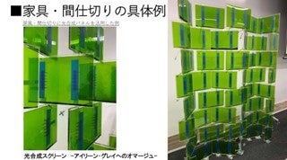 再生可能エネルギーに関する研究は多く行われていますが、光合成で水素イオンを発生させて電気エネルギーに変え、酸素を生み出し、緑色の美しい空間を作り出せる、という3点を同時に可能にしているものは他にありません。川上研究室と松尾研究室では、実際にびょうぶや窓に活用する光合成パネルを作成。屋根やひさしに光合成パネルを活用した、集合住宅やバス停などの建築デザインを考案しています。