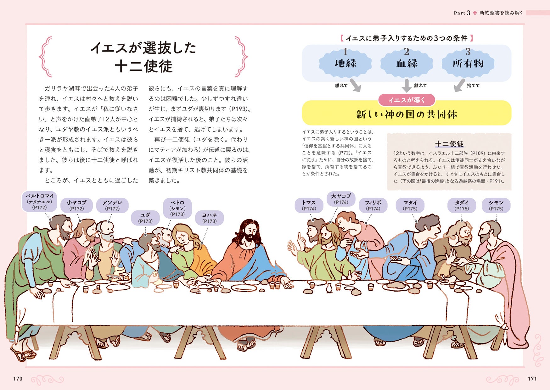 入門者向けに、キリスト教、ユダヤ教、イスラム教の三大宗教における聖書の位置づけから、キリスト教の成り立ち、広まった経緯、歴史などの基礎知識、旧約聖書・新約聖書の構成、登場人物、物語の主な場面まで、イラストとともにやさしく解説しました。