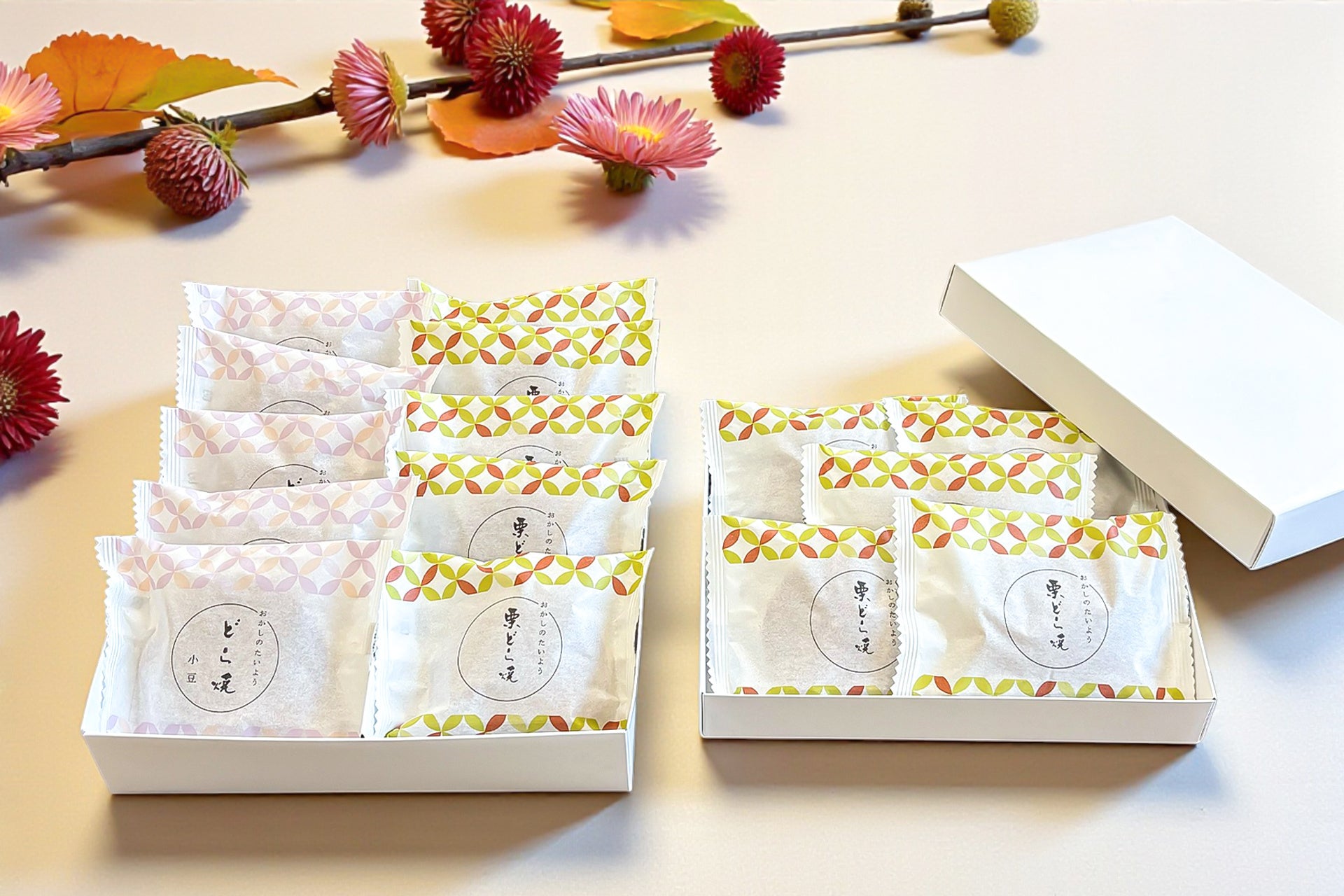1個から気軽にお買い求めいただける「栗どら焼き」ですが、贈り物には専用の化粧箱にお詰めしてご用意することも可能です。画像のように、当店オリジナルの小倉どら焼きと組み合わせた詰め合わせも承っております。シーンやご予算に合わせて、特別感のあるギフトとしてご利用ください。