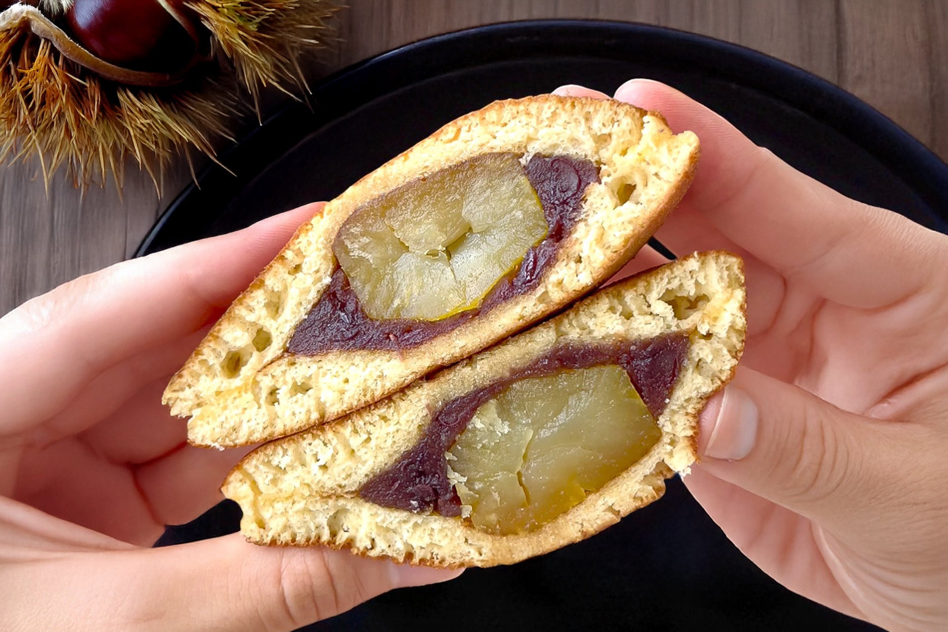 どら焼きを割った瞬間に現れる、黄金色に輝く大粒の実はまさに圧巻。