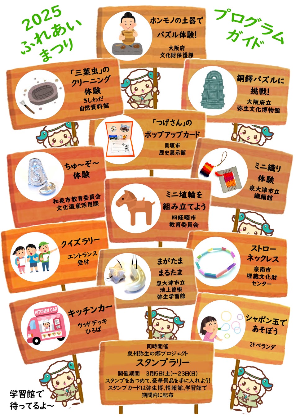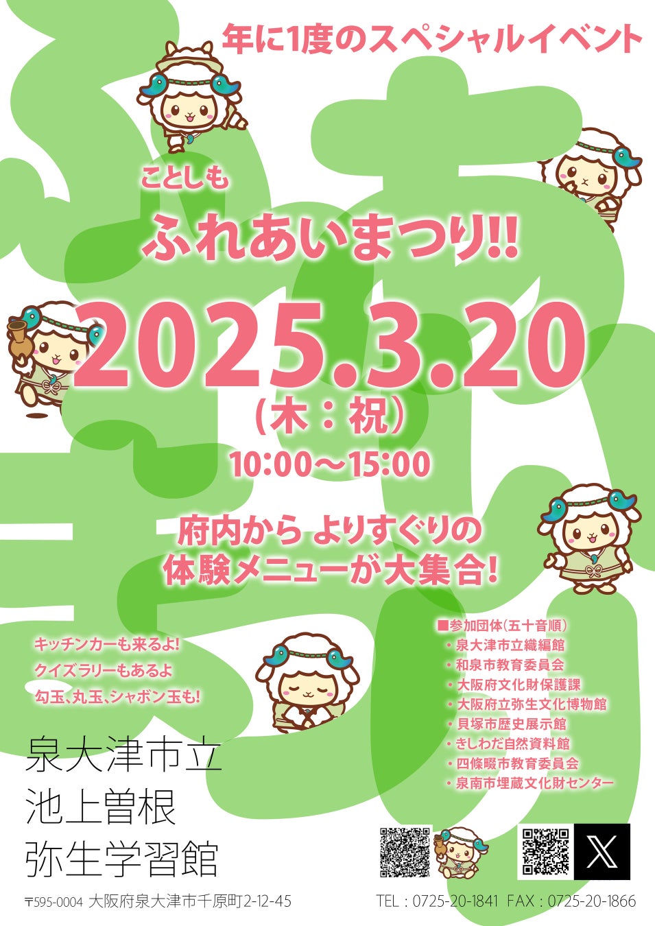 大阪府泉大津市(市長:南出賢一)では、3月20日(祝)に、泉大津市立池上曽根弥生学習館において、ふれあいまつりを開催します。今年度は、府内の博物館など9団体が出展。勾玉づくりや銅鐸鋳造体験などの考古学や歴史にふれるワークショップを中心に、子どもたちの興味をくすぐるブースが並びます。