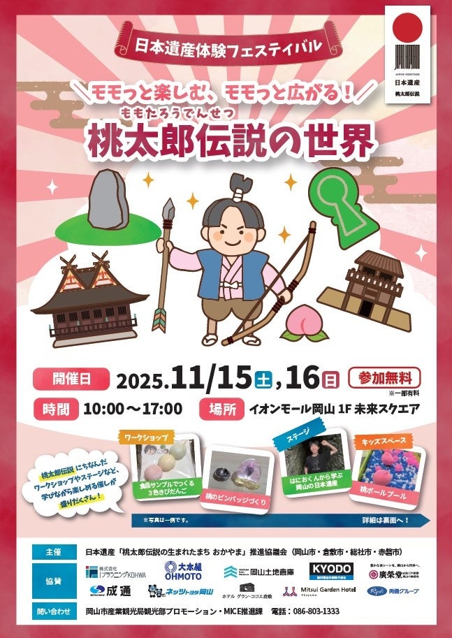 日本遺産「桃太郎伝説の生まれたまち おかやま」推進協議会(事務局:岡山市産業観光局観光部プロモーション・MICE推進課、岡山市北区大供一丁目1番1号)は、日本遺産「『桃太郎伝説』の生まれたまち おかやま~古代吉備の遺産が誘(いざな)う鬼退治の物語~」のストーリーを体感でき、親しめるイベントとして、令和7年11月15日(土)・16日(日)の両日、イオンモール岡山1階未来スクエア(岡山市北区下石井一丁目2番1号)で日本遺産体験フェスティバル「モモっと楽しむ、モモっと広がる!桃太郎伝説の世界」を開催します。