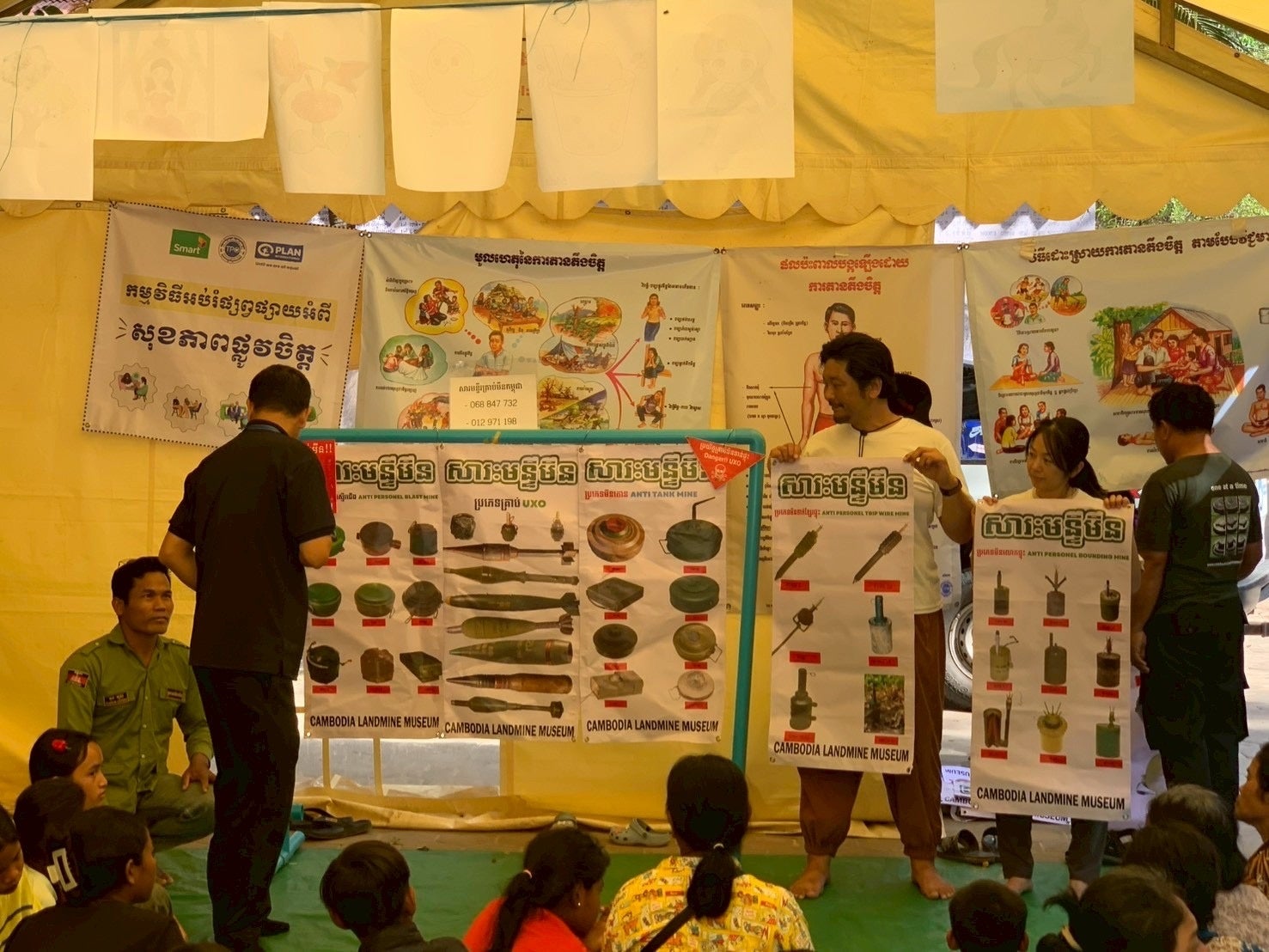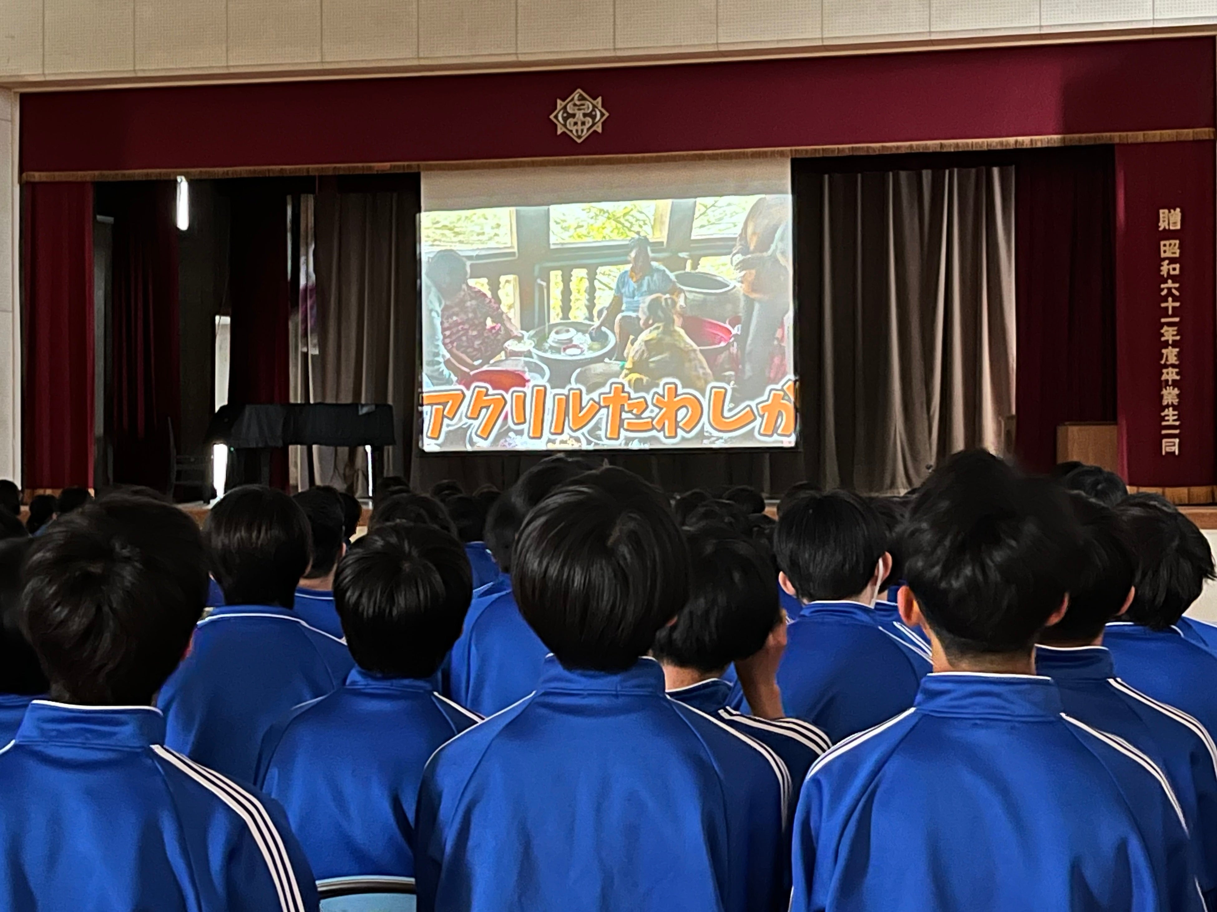 その後、難民キャンプでの食器洗いの場面において、臼井中学校の生徒たちが制作したアクリルたわしが実際に活用されました。
