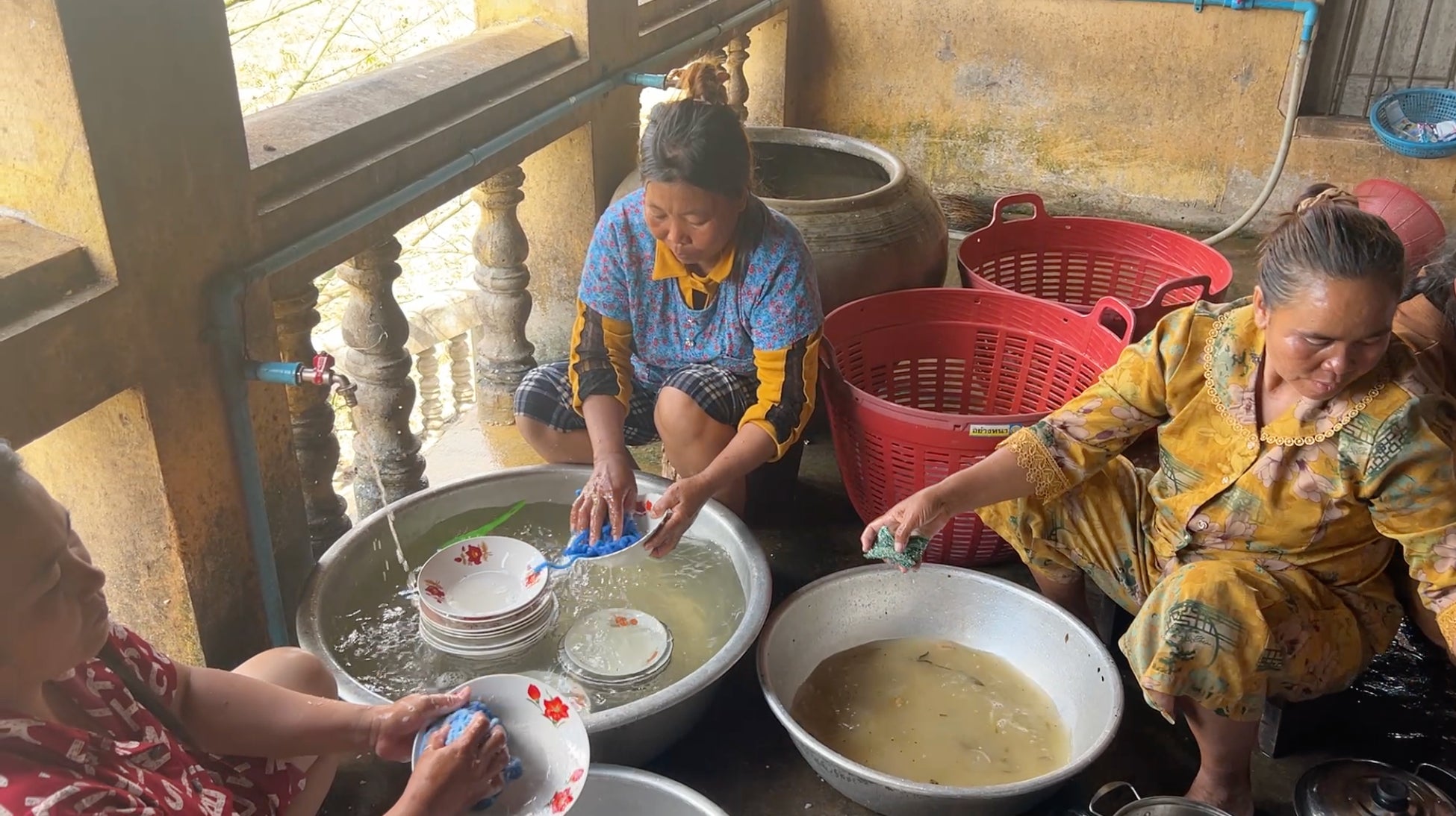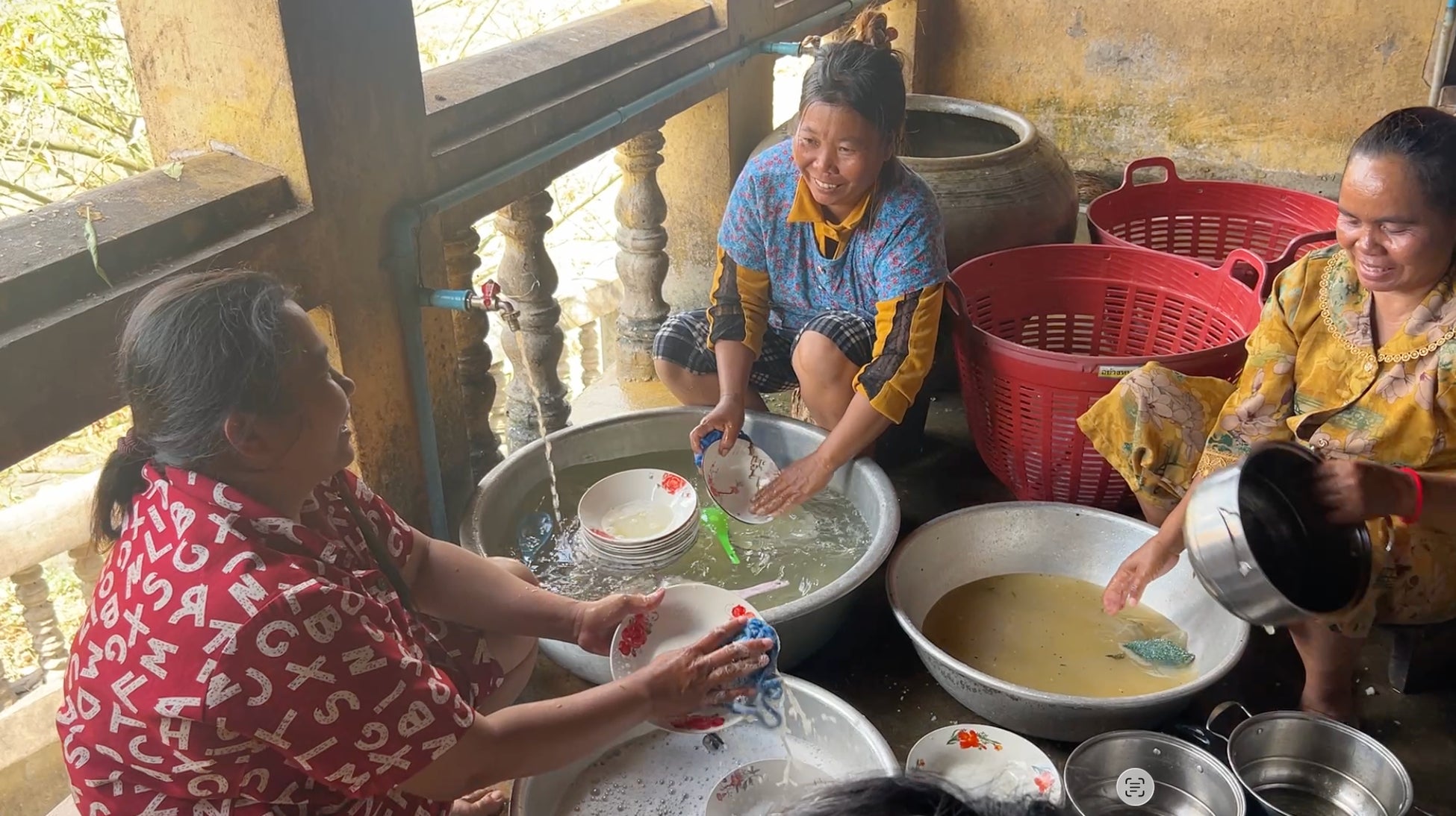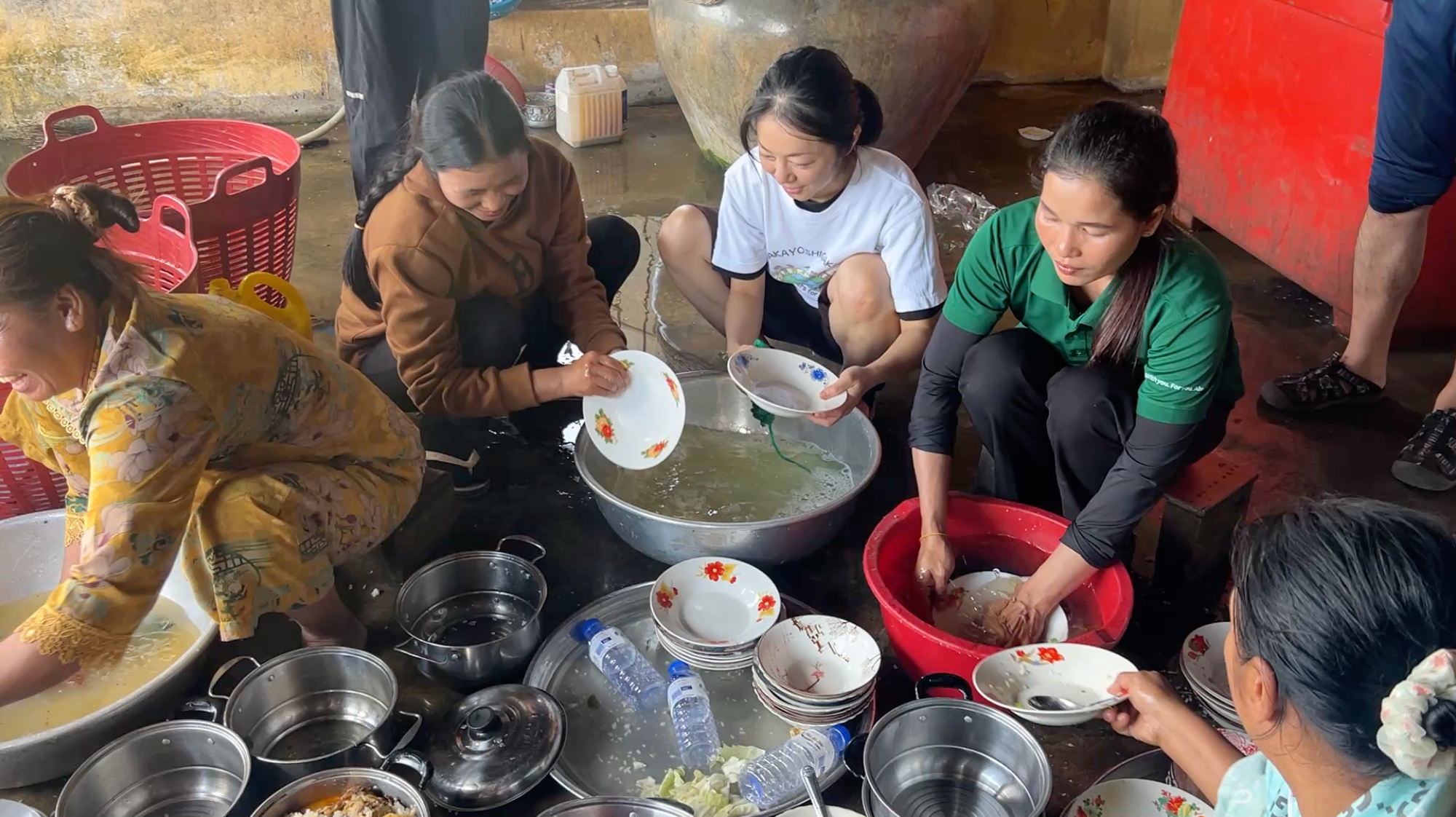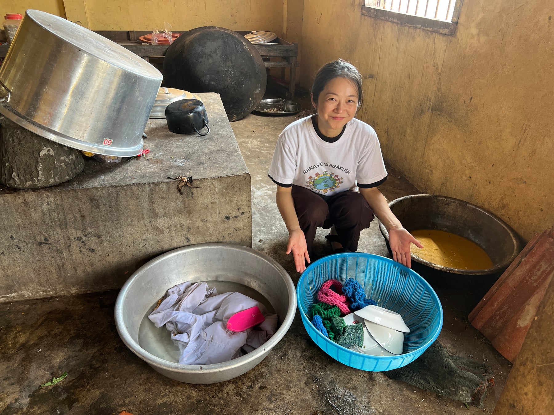 なかよし学園は、これらのアクリルたわしを2025年末にカンボジアへ運搬。戦禍を経験した地域の難民キャンプにおいて、「世界とつながる学び」参加校から提供されたお米を使用したおにぎりの炊き出しを行い、その後の食器洗いの場面で、臼井中学校の生徒たちが制作したアクリルたわしを活用しました。
