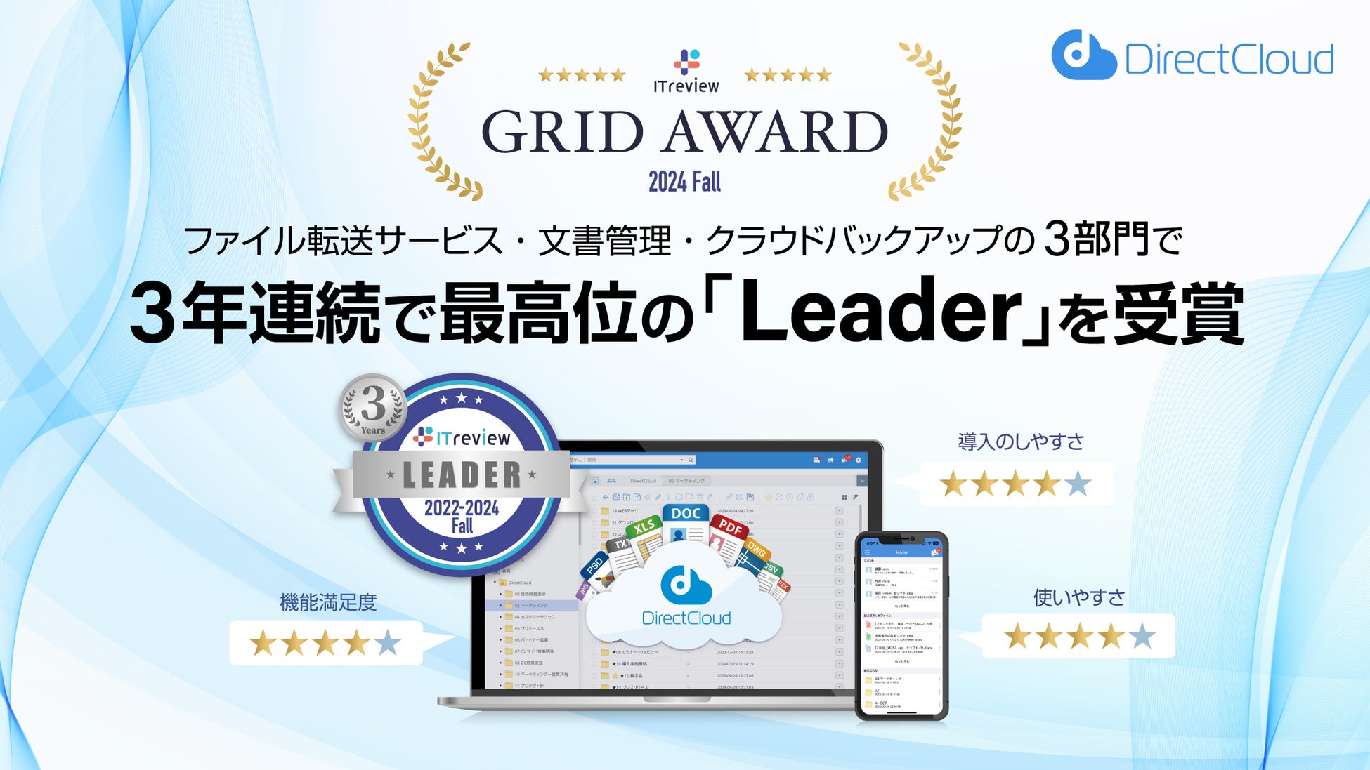 DirectCloudが「ITreview Grid Award 2024 Fall」の3部門で3年連続最高位「Leader」を受賞