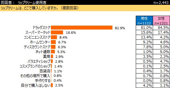 リップクリームは「ドラッグストア」で購入する人が82.9%と圧倒的でした。