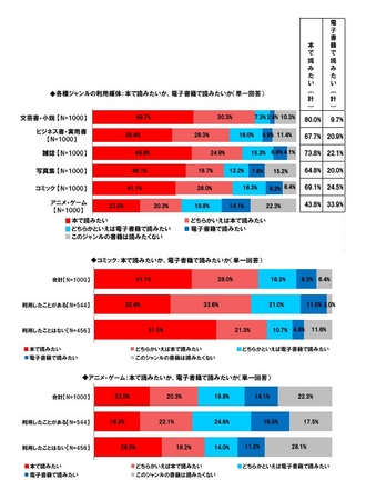 これを、電子書籍の利用経験別に比較すると、「アニメ・ゲーム」、「コミック」の2ジャンルで差が見られ、「アニメ・ゲーム」において、利用経験者は「電子書籍で読みたい」41.1%、「コミック」において、利用経験者は「電子書籍で読みたい」32.0%と全体よりもそれぞれ全体よりも5ポイント以上高くなりました。
