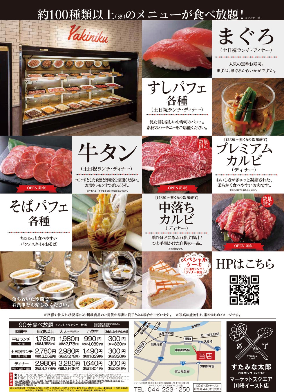 焼肉・寿司・スイーツ食べ放題レストランチェーンの「すたみな太郎」などを運営する株式会社江戸一(本社:東京都足立区、代表取締役社長:珊瑚 卓哉)は、神奈川県川崎市の「すたみな太郎 マーケットスクエア川崎イースト店」を全面改装のうえ、2025年12月20日(土)に「すたみな太郎 PREMIUM BUFFET マーケットスクエア川崎イースト店」としてリニューアルオープンいたします。すたみな太郎 PREMIUM BUFFETブランドとしては20店舗目の出店となります。オープニング記念限定メニューも登場!