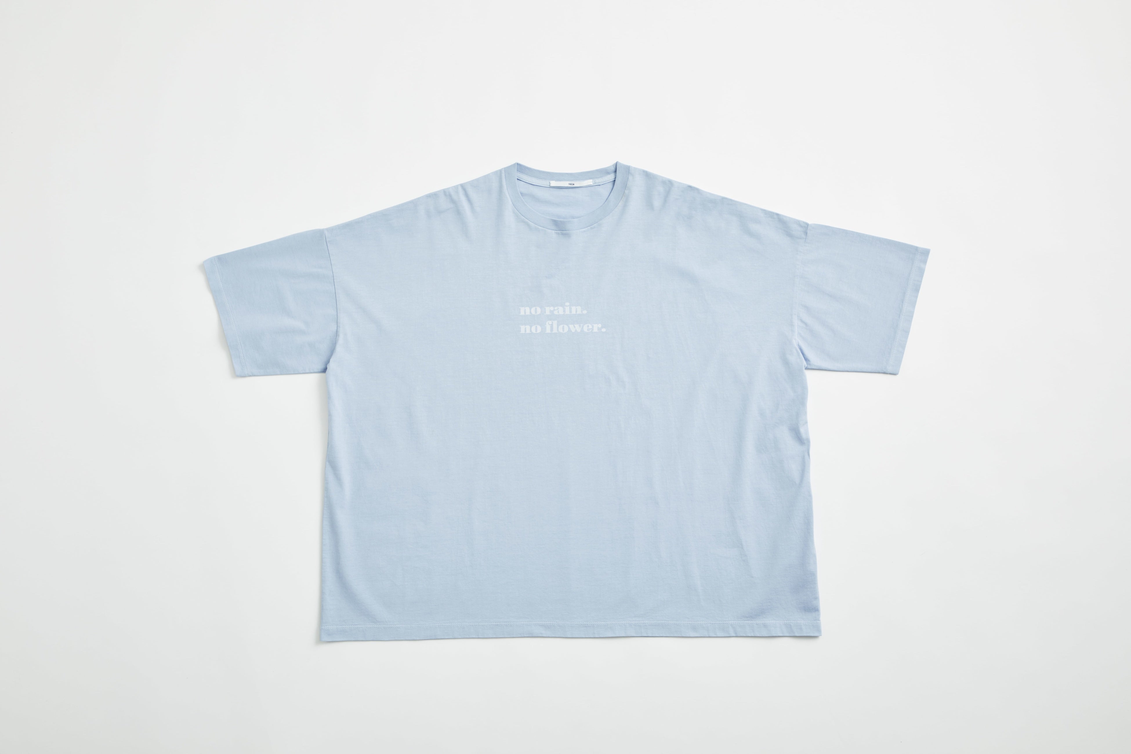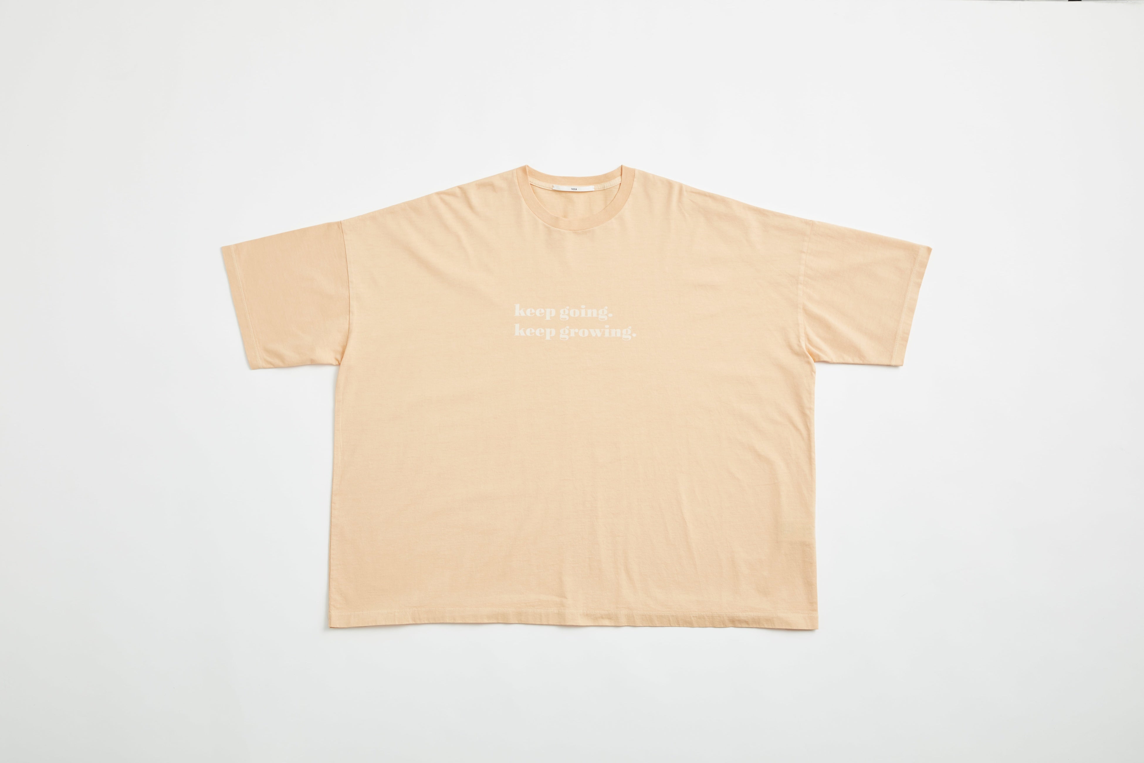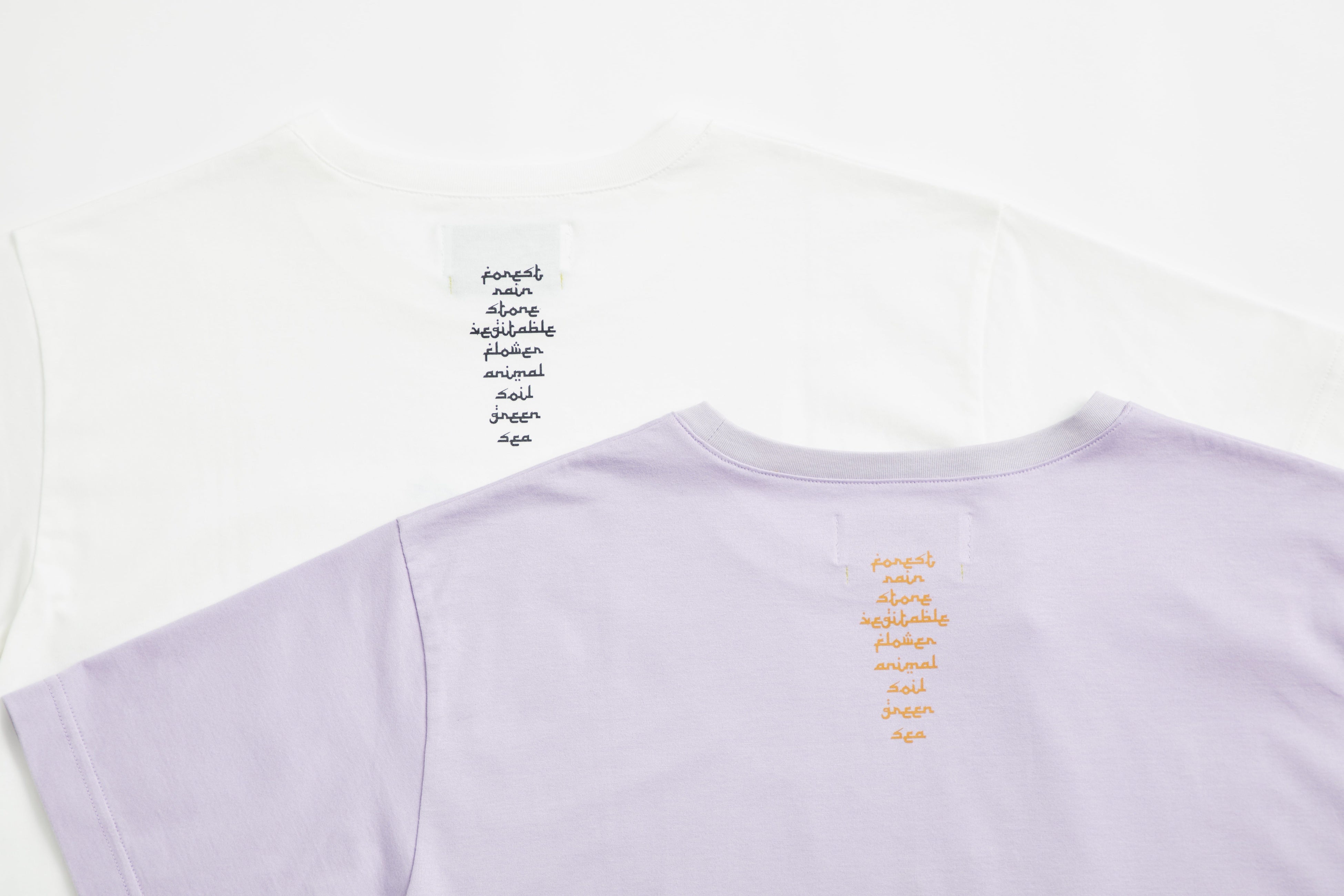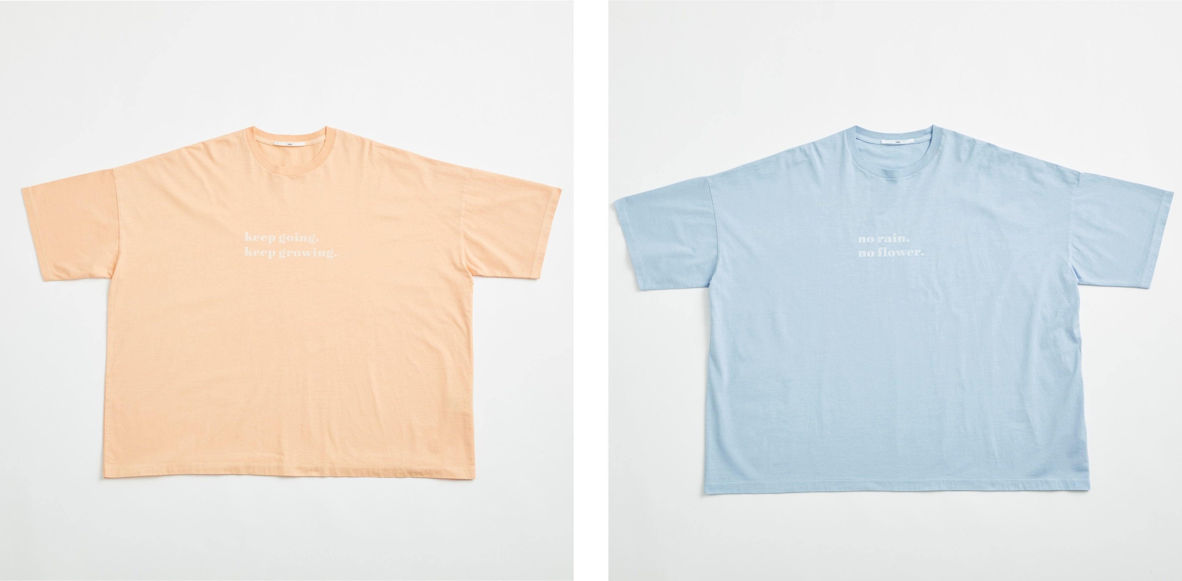 オーガニックコットン生地を使用し、ボタニカルダイで染色した別注デザイン。オレンジのカラーはマリーゴールド、ブルーはクチナシの花から色素を抽出した、植物由来の柔らかい色合いにこだわっています。それぞれのカラーにはポジティブなメッセージを込めたワードをプリント。程よく張りがありながら落ち感のあるビッグシルエットで、一枚で様になるデザインです。