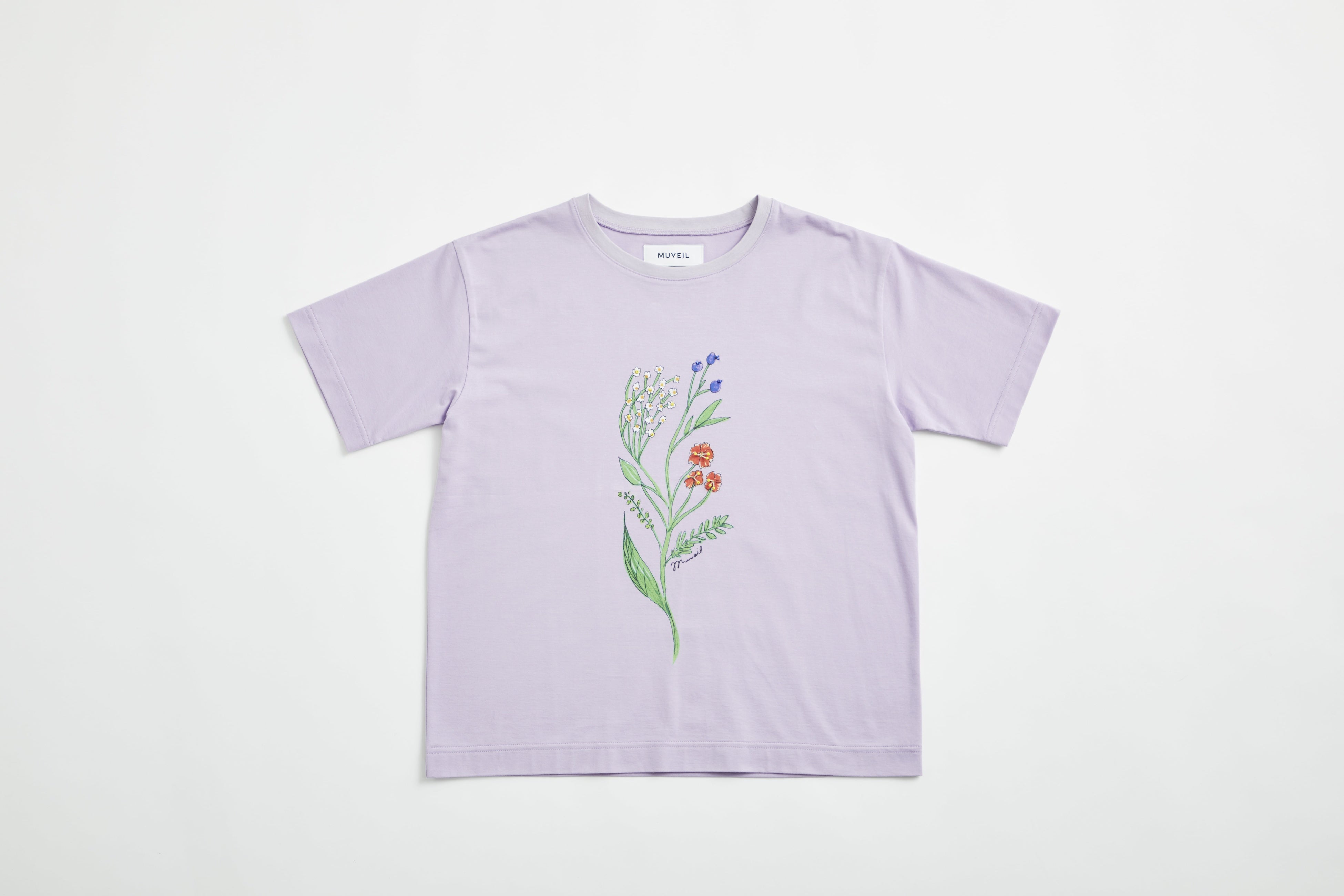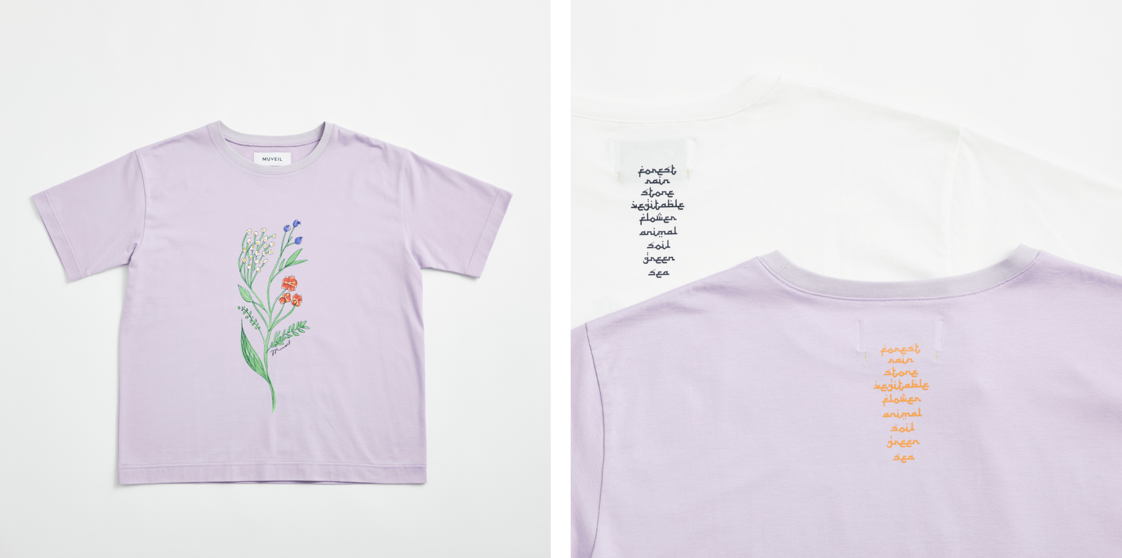 様々な花や葉が1本にまとまった、ボタニカルプリントの上にビーズの刺繍を施したMUVEILらしいデザイン。バックには、アラビアフォントで森、雨、石など自然を連想するワードをプリント。前身ごろの柔らかく繊細な植物のイラストとの対比が魅力的な一着です。オーガニックコットン生地を使用しています。