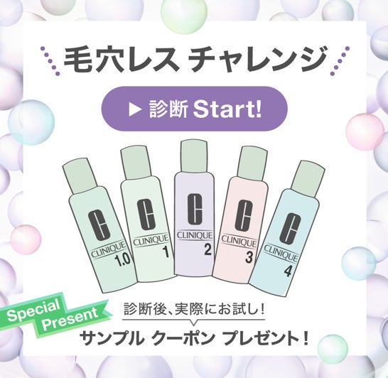 紫外線の強まりや、気温の上昇で、毛穴の開きやべたつきが特に気になる季節です。只今、クリニーク公式LINEアカウントをお友達追加いただくと、自分の毛穴タイプを見極められる「毛穴レス チャレンジ」をご体験いただけます。詰まり毛穴、しずく型毛穴、乾燥毛穴、ニキビ毛穴など、毛穴タイプに合わせた適切なお手入れは、キメが整い、毛穴の目立ちにくい*2、なめらかな肌への第一歩です。チャレンジ実施後は全国百貨店クリニーク コーナーで使用できるサンプル クーポンが手に入るチャンスも。ぜひ、ご体験ください!