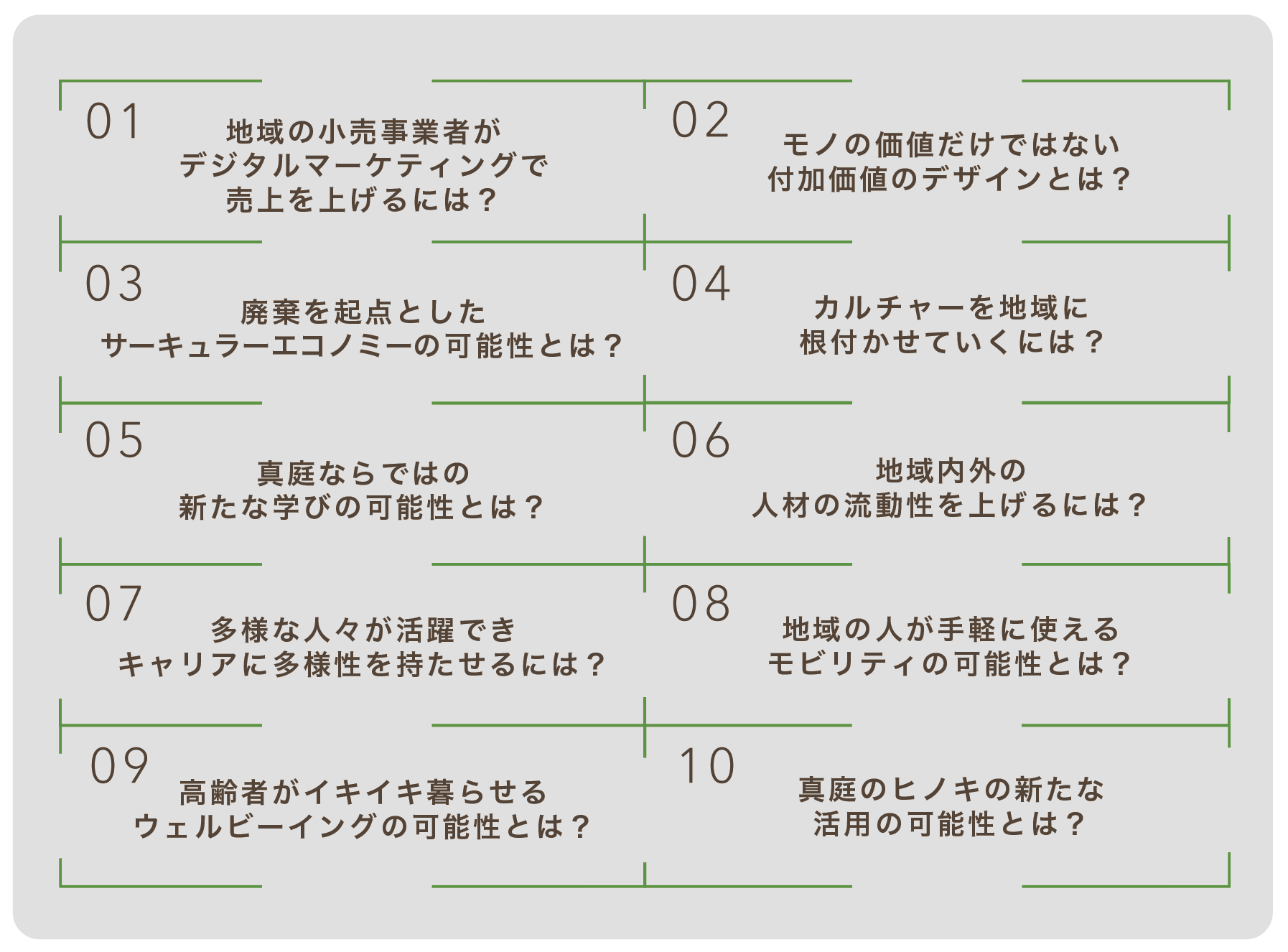真庭市内企業の参加募集はすでに終了し、複数社がテーマに対してチャレンジの名乗りを上げています。都市部に拠点を置く企業の公募期間は9月21日(水) 〜 10月14日(金)まで。オンライン説明会は、10月5日(水) 14:00〜15:30に開催します。社会課題にチャレンジする都市部の企業の参加をお待ちしております。