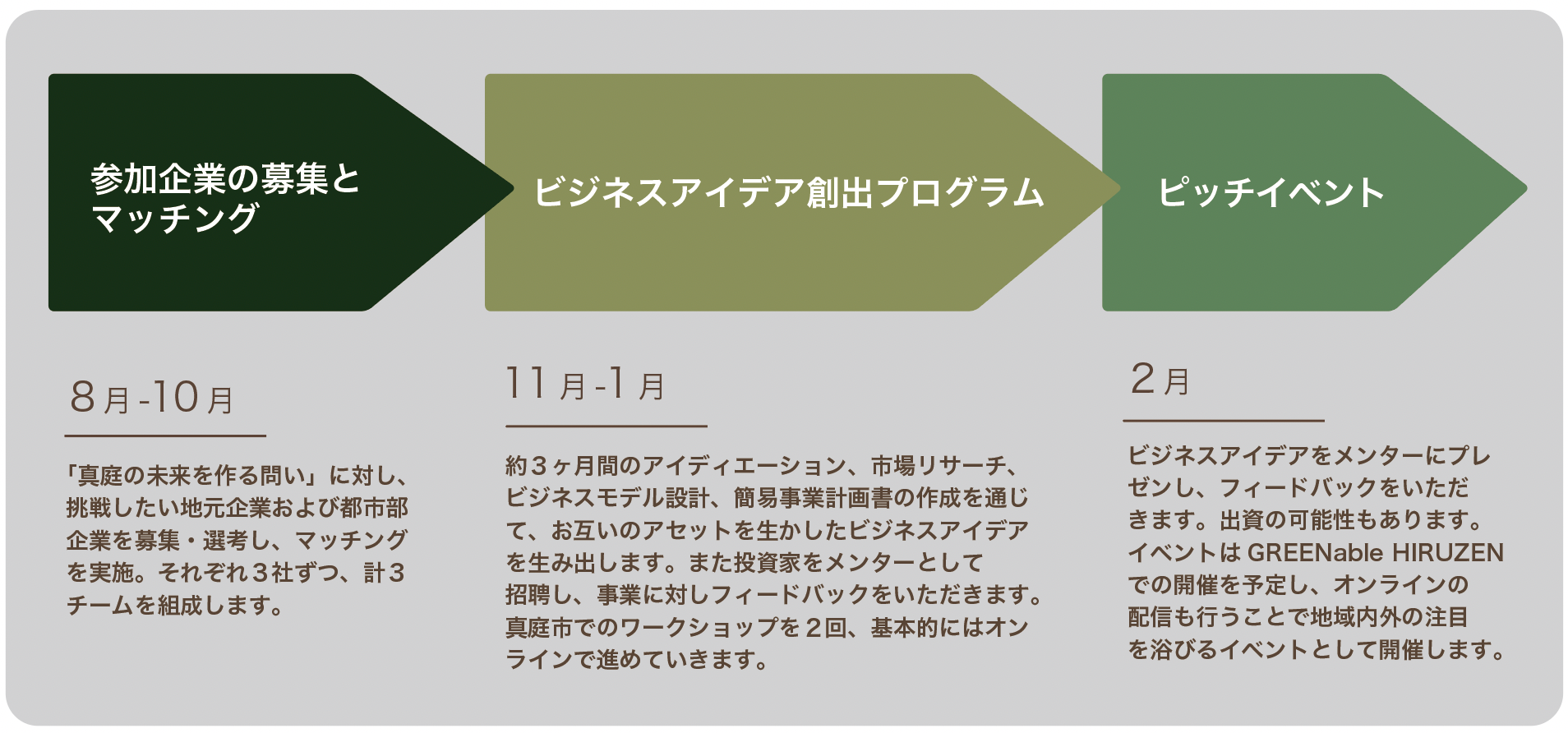 創出したビジネスアイデアは来年2月に、真庭の新たなランドマーク「GREENable Hiruzen」で開催される予定のピッチイベントにて、投資家へプレゼンテーションを行い、今後の実現に向けた資金を得るチャンスを得ます。