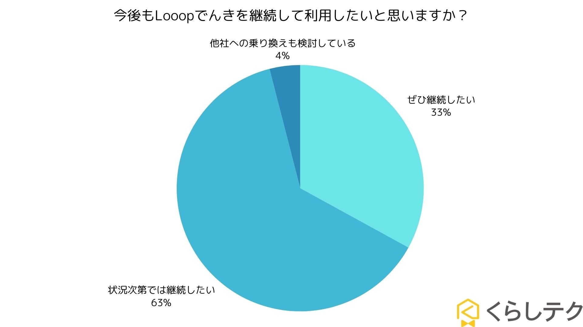 「今後もLooopでんきを継続して利用したいと思いますか?」という設問に対しては、「ぜひ継続したい」が33.0%、「状況次第では継続したい」が63.0%と、合計96.0%のユーザーが継続利用に前向きな姿勢を示しました。