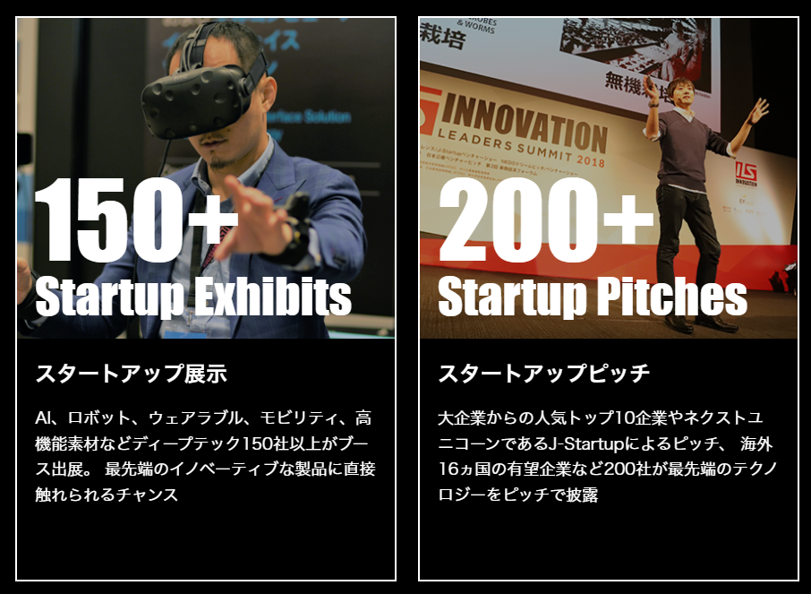 - 大企業からの人気トップ10企業やネクストユニコーンであるJ-Startupによるピッチ、 海外16ヵ国の有望企業など200社が最先端のテクノロジーをピッチで披露