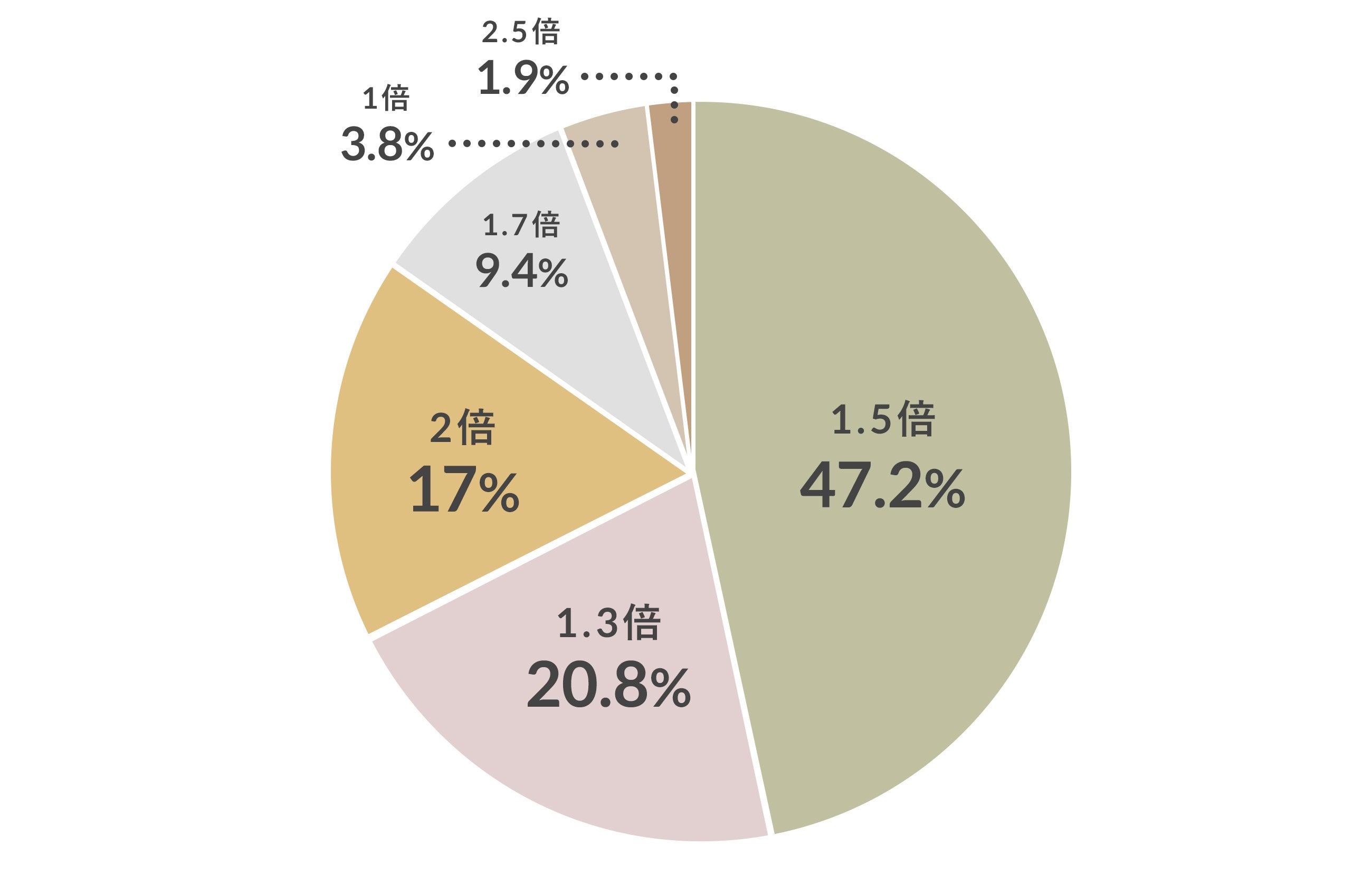 最も回答が多かったのは「1.5倍」(47.2%)で、「1倍(現在の電気料金と同じ)~1.5倍」で71.8%を占める結果となりました。「1倍~2倍」は98.1%で、電気料金が現在の2倍以上になると、再生可能エネルギーは人々に受け入れにくいことがうかがえます。