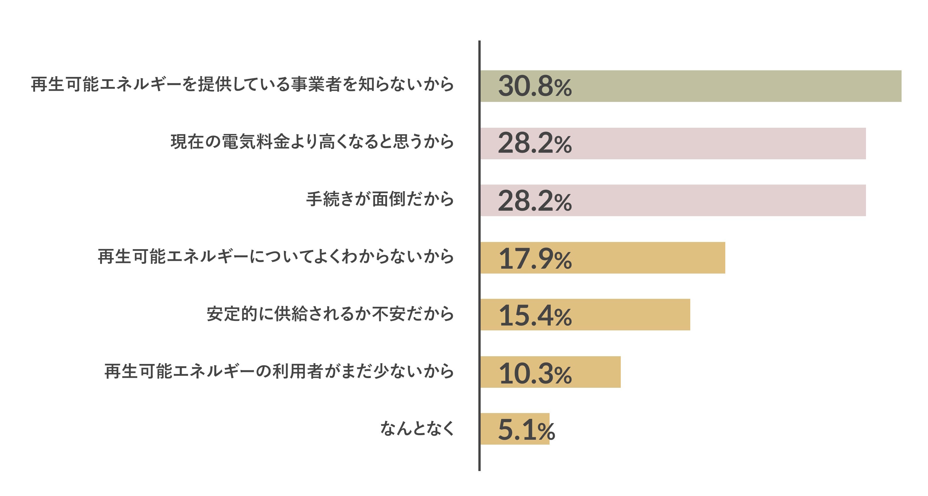 回答が最も多かったのは「再生可能エネルギーを提供している事業者を知らないから」(30.8%)。次いで、「現在の電気料金より高くなると思うから」「手続きが面倒だから」(各28.2%)となりました。再生可能エネルギーの利用に興味を持っていても、提供している事業者を知らないことや、電気料金が上がる可能性、手続きがネックとなっていることが伺えます。