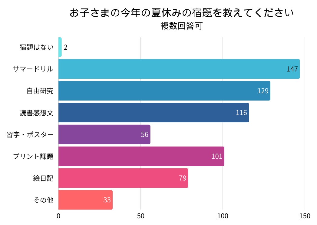 アンケート結果によると、最も多かった宿題は「サマードリル(147件)」で、基礎学習を重視する傾向がうかがえます。「自由研究(129件)」「読書感想文(116件)」など、思考力や表現力を育てる課題も多くの家庭で取り組まれており、ドリル型と探求型の宿題がバランスよく出されていることが分かります。