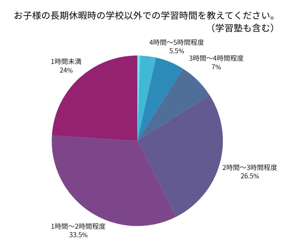 アンケート結果によると、最も多かったのは「1〜2時間程度」の学習時間(33.5%)、次いで「2〜3時間程度」(26.5%)で、全体の6割以上が1〜3時間の学習を行っていることがわかりました。夏休み中でも、無理のない範囲で学習習慣を維持している家庭が多いようです。
