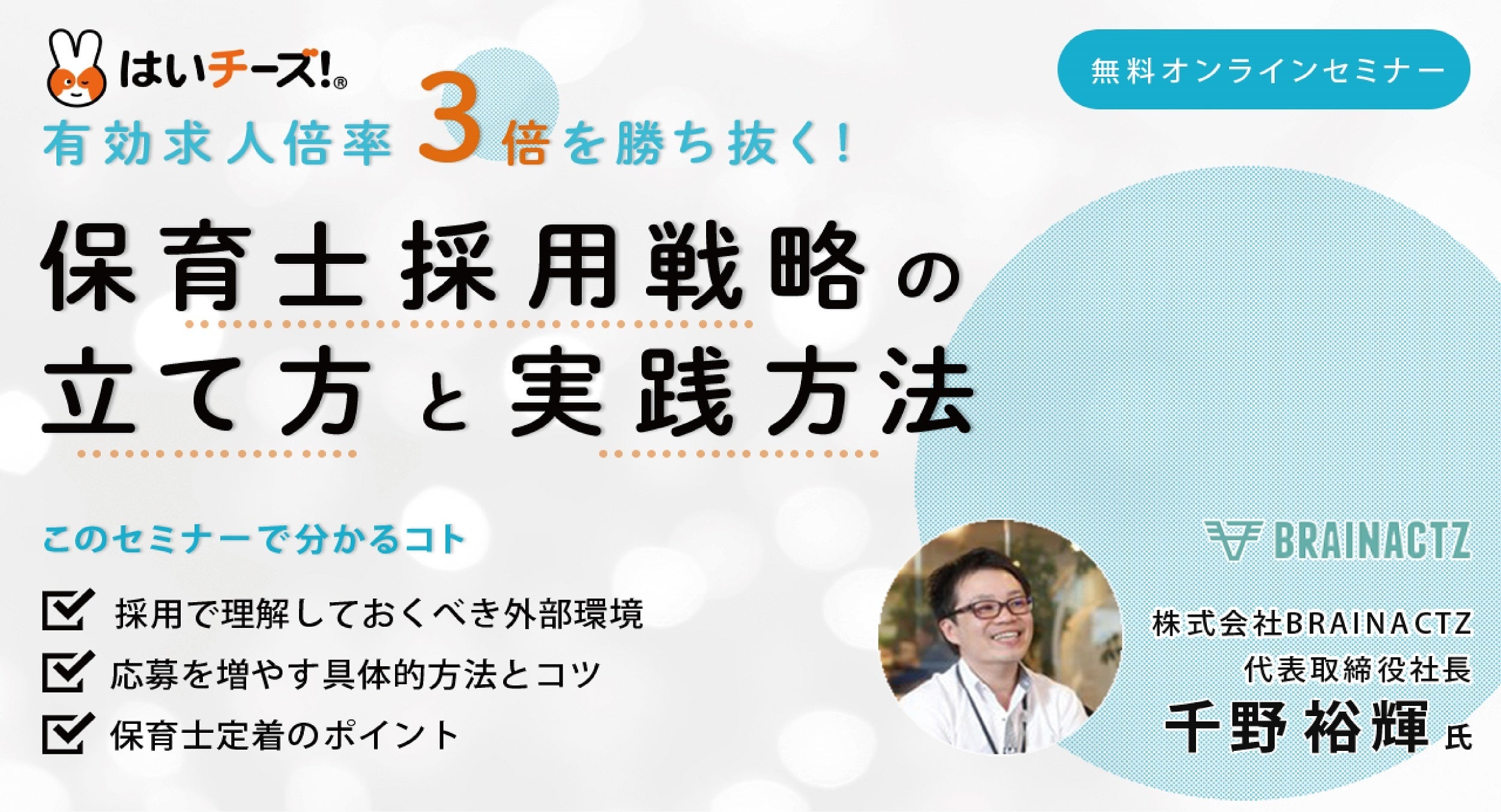 今回のオンラインセミナーでは、株式会社brainactz 代表取締役社長 千野裕輝様を講師にお招きして、現在の保育士採用・転職に関わる社会的背景も踏まえ、保育士から選ばれる園になる採用戦略についてお話します。