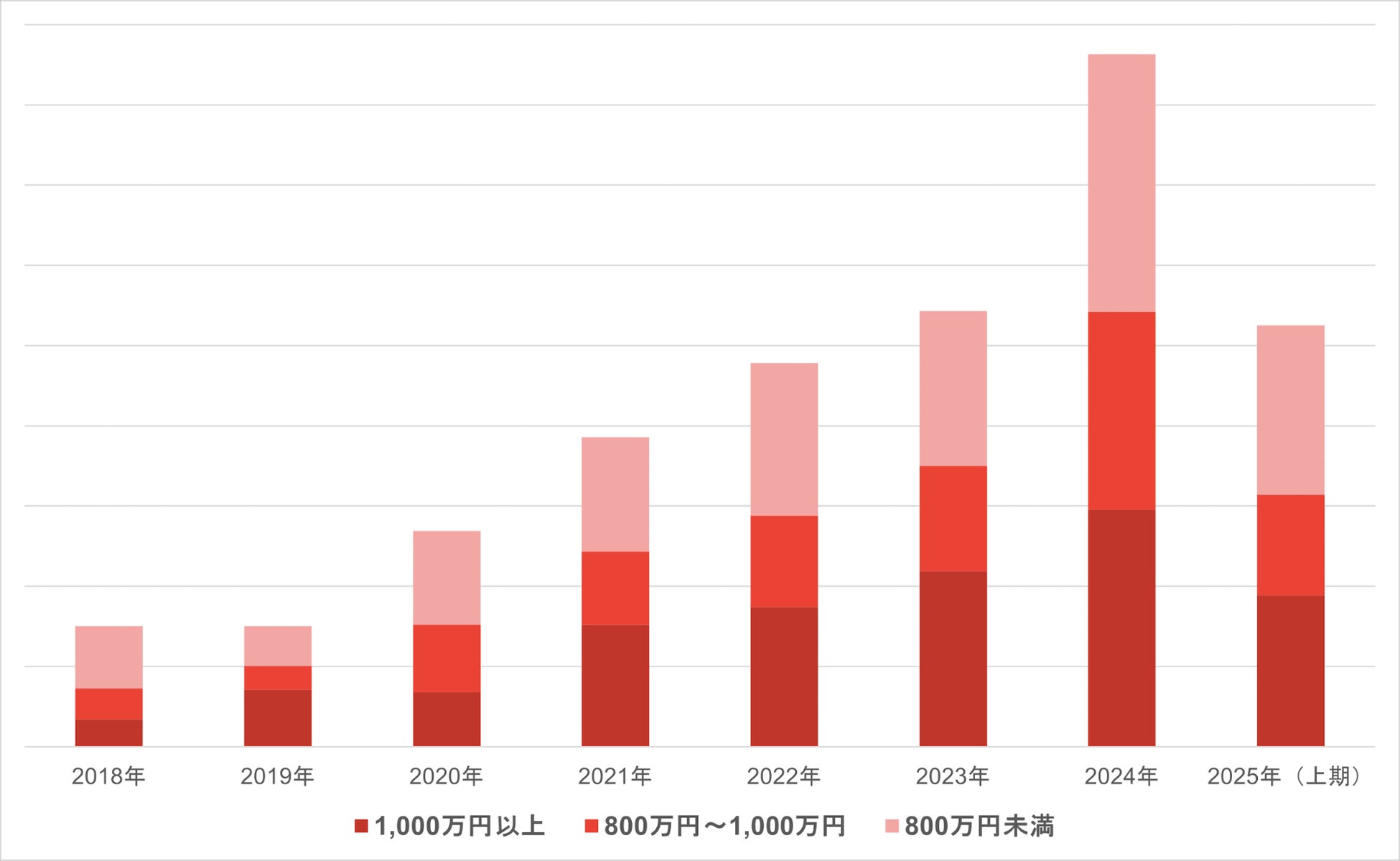 募集年収ごとの求人数は、以下の通りです。2021年以降、全体の求人数の中でも、1,000万円以上の高年収帯の求人の割合が高いことがわかります。