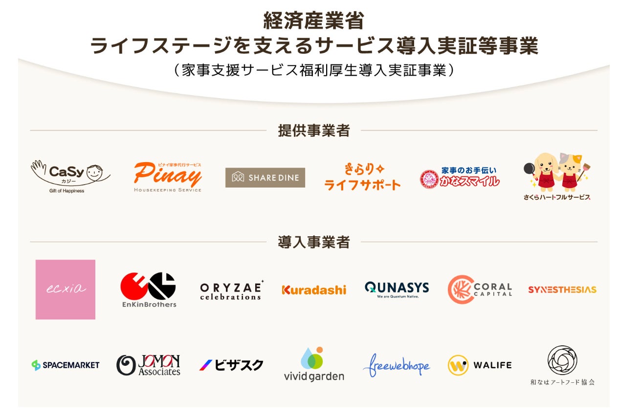 株式会社CaSy、株式会社ピナイ・インターナショナル、株式会社シェアダイン、株式会社ぴんぴんきらり、株式会社アドベル、株式会社楽土舎の家事代行事業者6社は、福利厚生として家事代行を導入する25社と共に「家事支援サービス福利厚生導入実証事業」に採択されました。