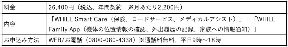WHILL社はまた、ご本人と家族により安心かつ快適な移動体験を提供するため、Model S**だけのプレミアムなサービスとして「WHILL Premium Care」を開発しました。保険やロードサービス、メディカルアシストがセットになった既存のサポートサービス「WHILL Smart Care」と、ご本人と家族がスマートフォンのアプリ上で機体の居場所や状態、お出かけ記録などの外出情報を共有できる「WHILL Family App」を一緒にしたもので、26,400円(税込、年間契約 ※月当たり2,200円)でご利用いただけます。