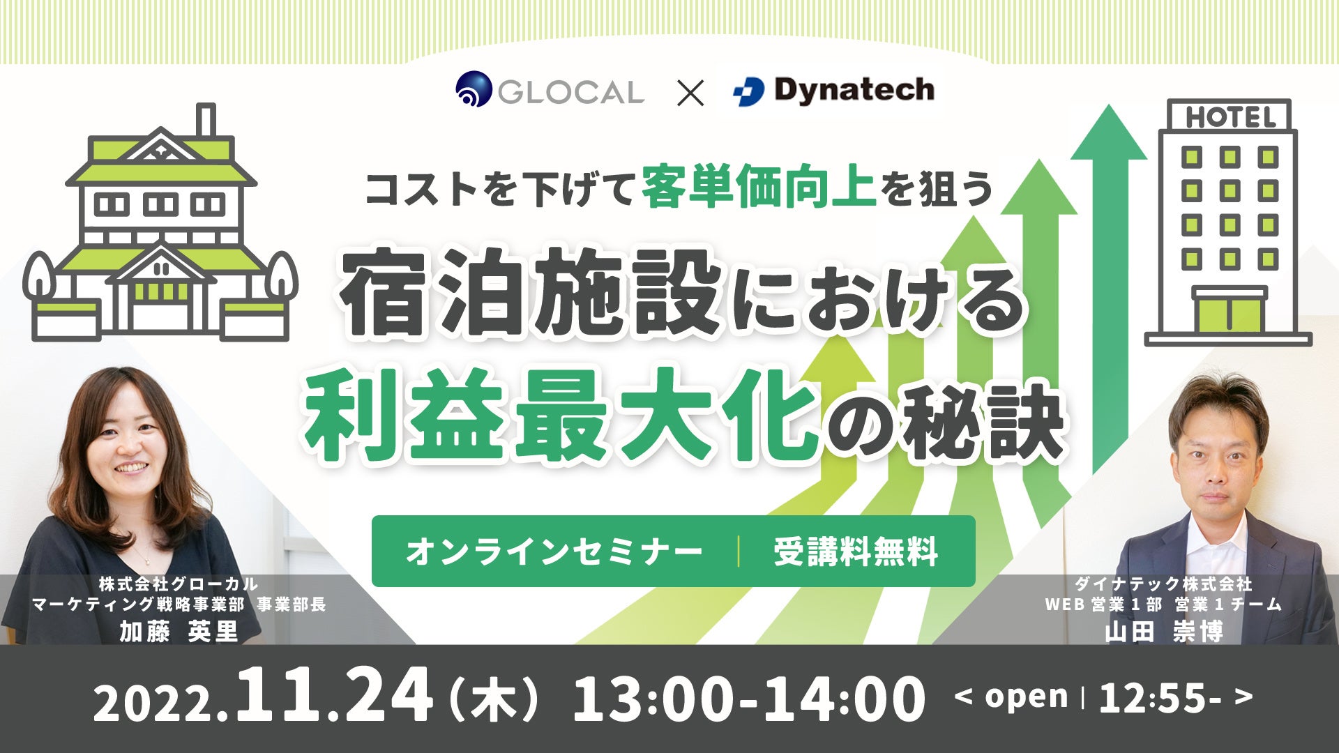 そこで今回は、宿泊施設の売上・利益向上を支援する株式会社グローカルと、宿泊施設の自社予約を最大化する宿泊予約システムや宿泊管理システムの開発・販売を行うダイナテック株式会社の共催で、ポストコロナ時代の宿泊施設における利益最大化の秘訣をお伝えします。
