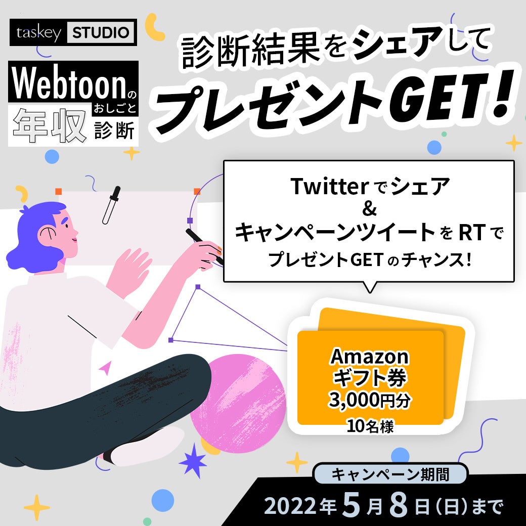 「Webtoonのおしごと年収診断」の診断結果をTwitterでシェアして、@taskey_STUDIOのアカウントをフォローし該当ツイートをRTすると、抽選で10名に3000円分のAmazonギフト券が当たるキャンペーンを実施中です。