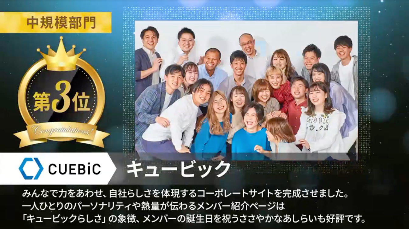 株式会社キュービック(本社:東京都新宿区、代表取締役社長:世一 英仁、以下「キュービック」)は、Great Place to Work® Institute Japan(本社:東京都品川区、代表取締役:荒川 陽子、以下「GPTW」)が発表した、2022年版 日本における「働きがいのある会社」ランキングの中規模(従業員100-999人)部門においてベストカンパニーに選出され、第3位を獲得したことをご報告いたします。当アワードで公表されるのは、調査結果に基づきベストカンパニーとして認定された企業のみであり、キュービックは5年連続のランクインを果たしました。
