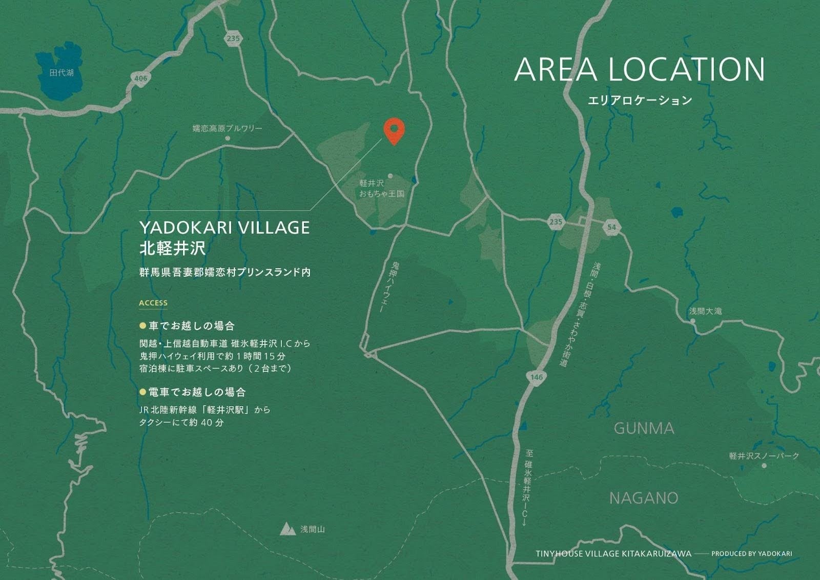 アクセスは、関越自動車道 碓氷軽井沢ICから鬼神ハイウェイ利用で約1時間15分ほどの場所にあります。周辺には、スキー場をはじめとする自然を楽しめる施設のほか、子供向けのテーマパークや、ブルワリーなど様々な過ごし方をイメージできる施設が数多く点在しています。