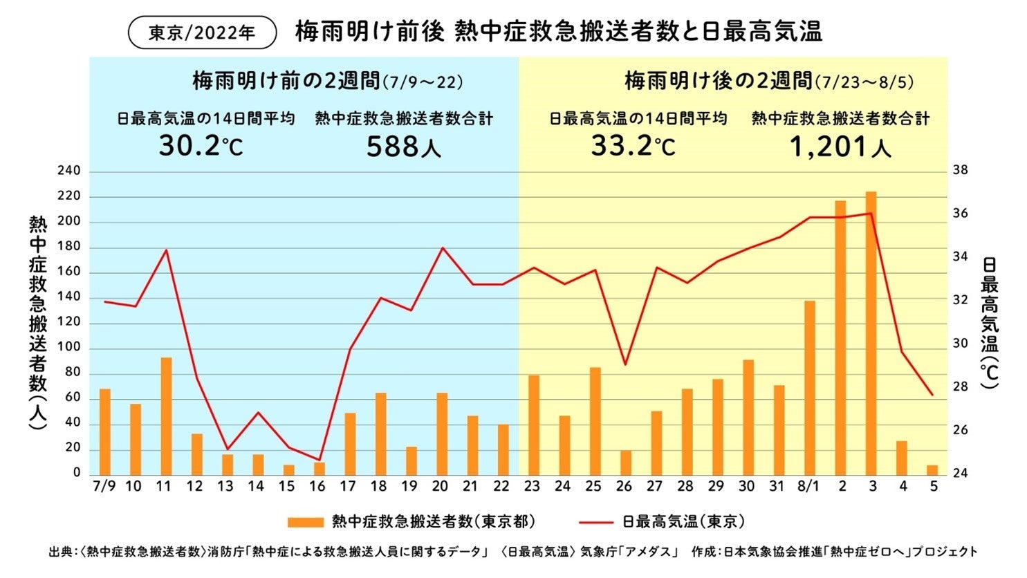 関東甲信地方の梅雨明けは7月23日ごろでしたが、東京の梅雨明け前後の2週間の熱中症による救急搬送者数を比較すると、梅雨明け前(7月9日~7月22日)は588人だったのに対し、梅雨明け後(7月23日~8月5日)は1,201人と約2倍となりました。