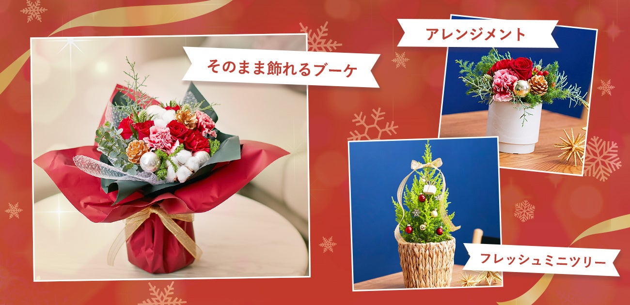 クリスマスカラーのラッピングで届きすぐに飾れる「そのまま飾れるブーケ」、ゴールドの松ぼっくりやオーナメントがキラキラとしたクリスマスを演出する「アレンジメント」、キラキラと輝くオーナメントや存在感のある可愛らしいリボンがクリスマスを演出する「フレッシュミニツリー」など、クリスマス限定の商品をブルーミーオンラインストアで販売します。