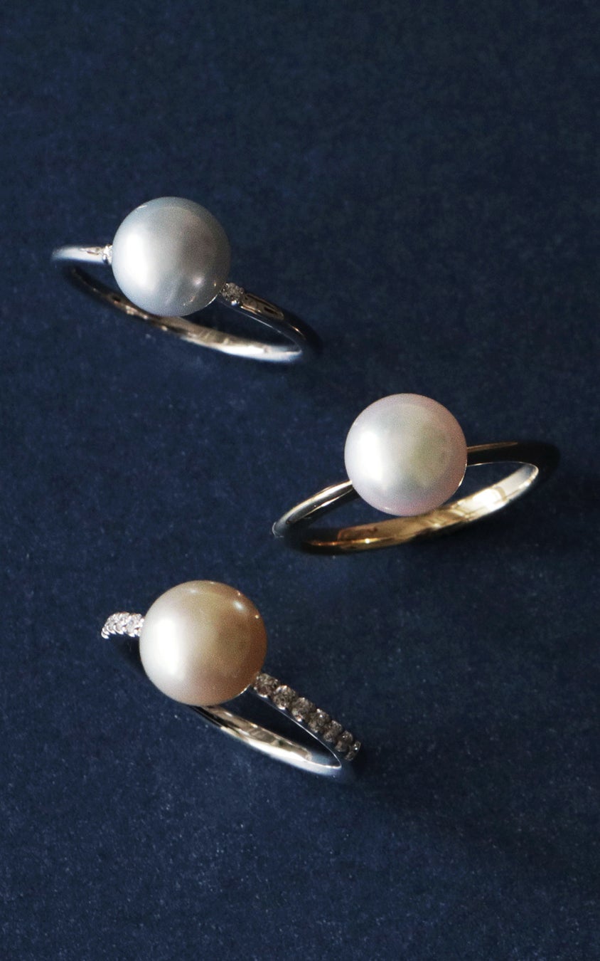 凛とモダンな印象が漂う、ナチュラルブルーのアコヤ真珠の両サイドに一石ずつメレダイヤモンドをあしらったデザイン。華奢なリングアームと真珠の対比が目を惹きます。