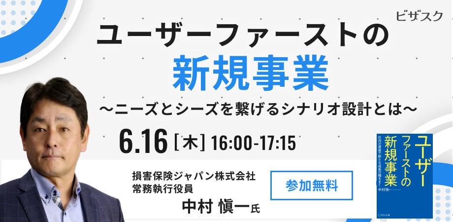 「知見と、挑戦をつなぐ」をミッションにグローバルなナレッジプラットフォームを運営する株式会社ビザスク(以下、当社)は、「ユーザーファーストの新規事業〜ニーズとシーズを繋げるシナリオ設計とは〜」をテーマに、損害保険ジャパン株式会社常務執行役員である中村愼一氏のご登壇による無料オンラインセミナーを、6/16(木)16時より開催します。