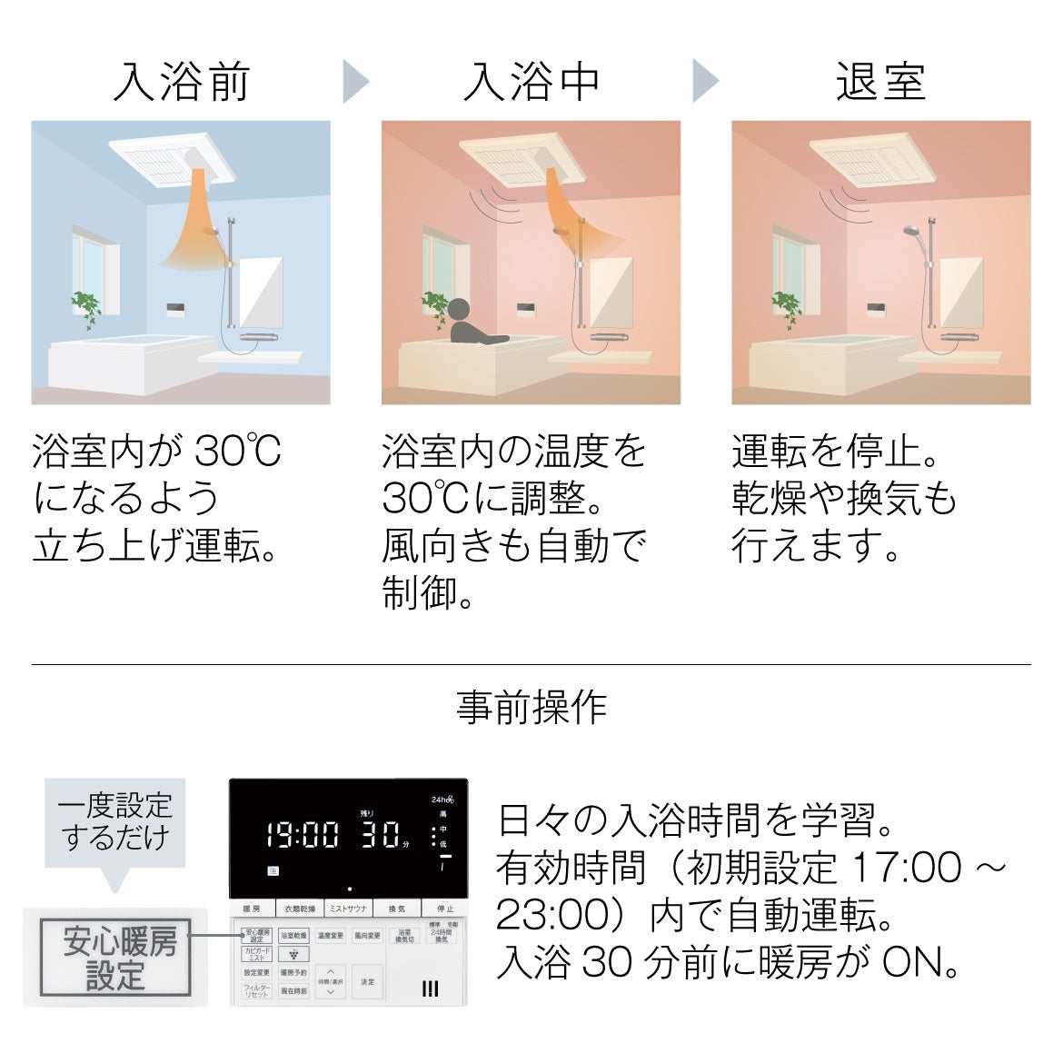 「安心暖房」機能搭載の浴室暖房乾燥機なら、浴室内の人の動きと温度を感知し、自動で最適な暖房運転を行います。寒い日も快適な室温を保つため、高齢者などのヒートショック対策にも役立ちます。