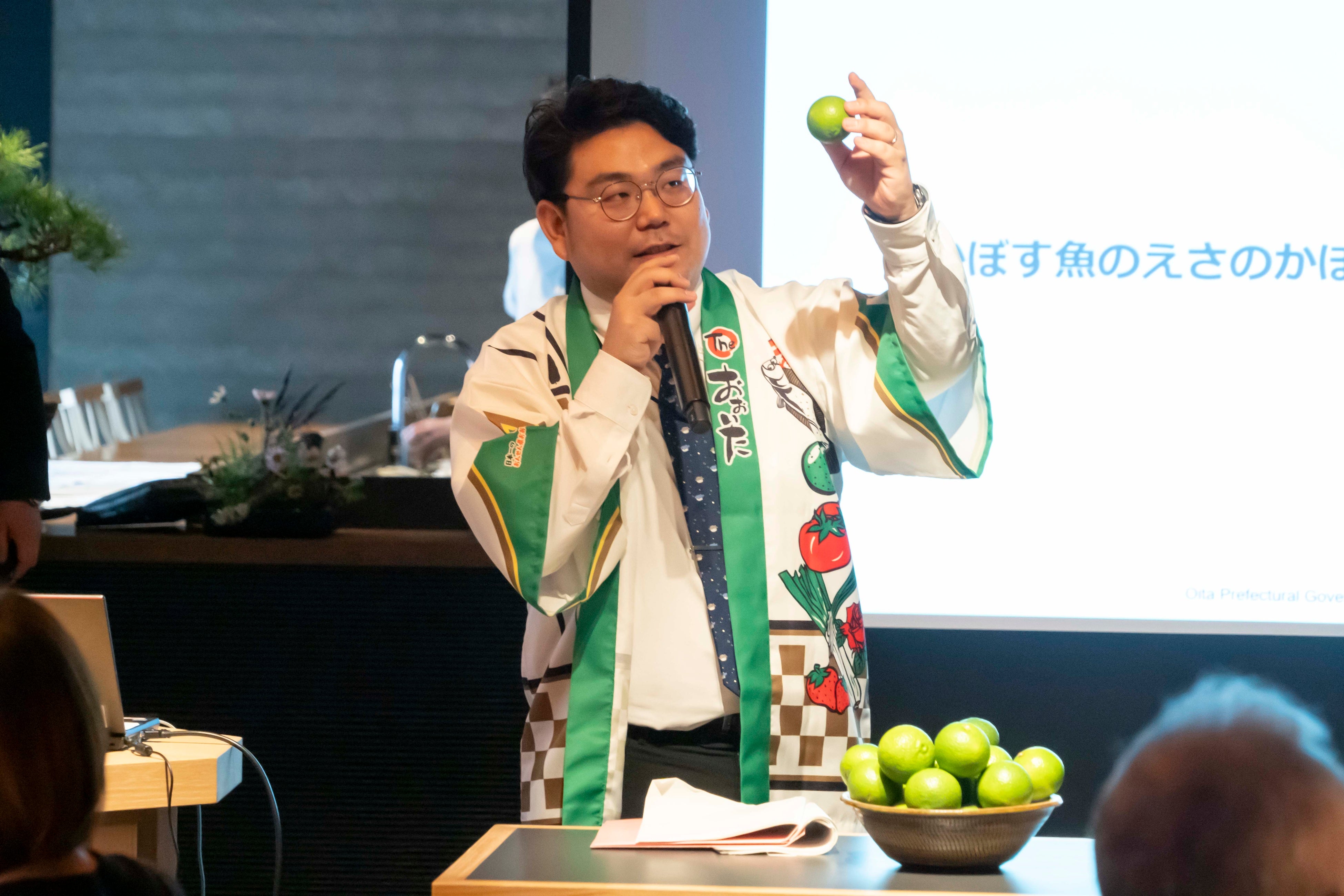 大分県 東京事務所 横山純一 主任は、「かぼす魚等、大分の魚の魅力」について「全国シェア1位のかぼすを有効活用することで、血合の色鮮やかな状態や鮮度を維持し、爽やかな香りとさっぱりとした味わいの養殖ブリを実現しました」と話しました。