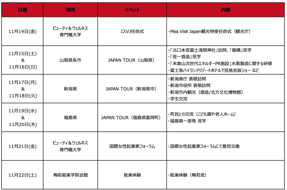 山梨県では、世界文化遺産構成資産となる「北口本宮冨士浅間神社」や日本三奇橋のひとつ「猿橋」の訪問で日本の歴史・自然美に触れるほか、笹一酒造や米倉山次世代エネルギーPR施設を訪れ日本の伝統産業や環境への取り組みを視察する予定です。新潟県では、日本酒の酒造見学や北方文化博物館の見学などを通して日本の「文化」に触れ、地域の人々との交流を深めます。また、福島県では、福島第一原発の視察後、ALPS処理水、除去土壌復興再利用についての勉強会や地元の方たちとの交流を通して、世界のミスたちが復興へのメッセージを発信します。