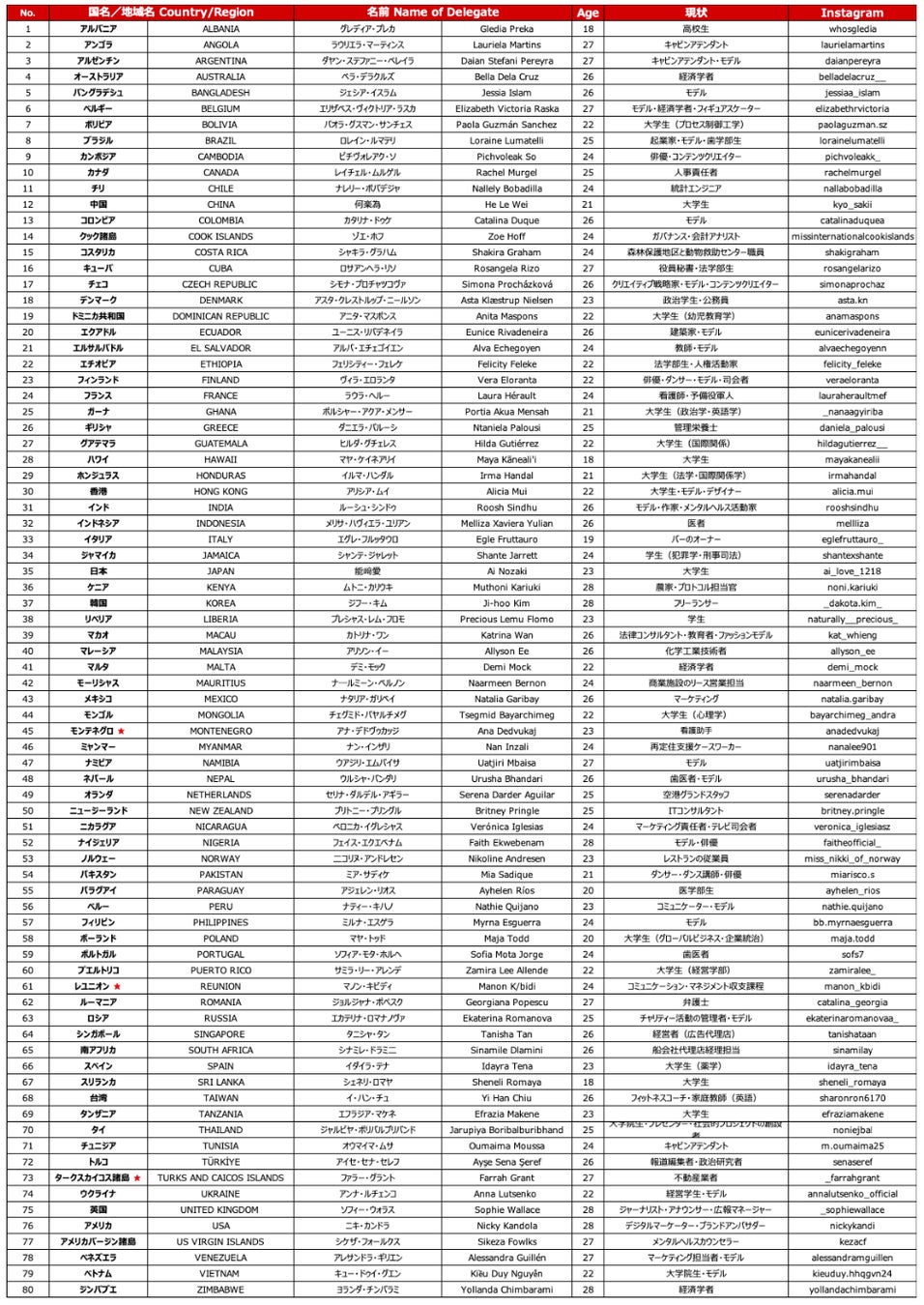今年は80※の国と地域から“美と平和の親善大使”の出場が決定しました。 そのうち、モンテネグロ、レユニオン、タークス・カイコス諸島の3カ国・地域が初出場を果たします。代表者たちは11月12日(水)より来日し、約2週間にわたり日本各地で社会貢献・文化交流活動を展開します。 これらの活動は大会審査の一環でもあり、“外見の美しさ”だけでなく、思いやりや知性に裏づけられた“心の美しさ”が問われます。