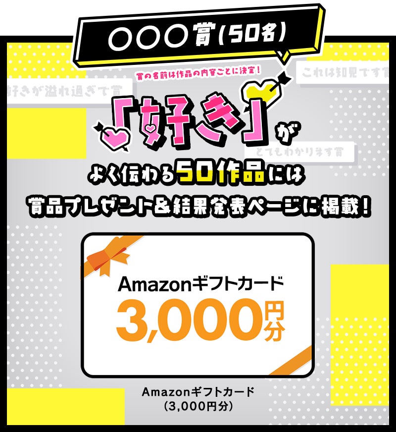 賞の内容は、結果発表までのお楽しみ!?受賞者50名のうち1名に抽選で豪華賞品プレゼント!