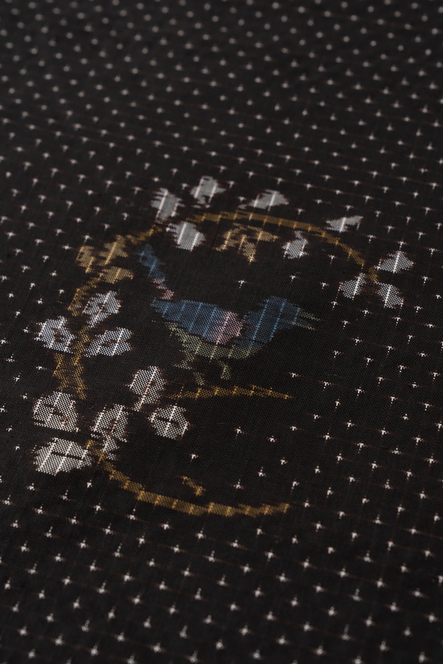 絶滅危惧種に指定され、幻の花と呼ばれる「アマミセイシカ」をモチーフにしました。花言葉の「自尊心」から「着る人が自分自身の気持ちや個性を大切に、いつまでも笑顔で過ごしてほしい」という想いを込めています。 泥染めの黒に柄が浮かび上がるように見えるのは、織工の方の丁寧な手しごとによるもので、より美しく立体感のあるデザインになっています。