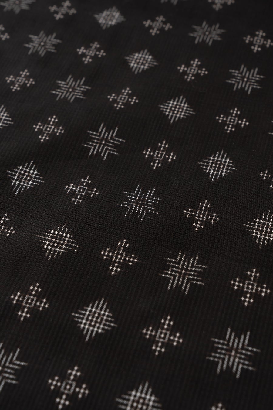 奄美大島の自然を表現した絣文様を「海に降り注ぐ星」に見立てて大胆な斜めのストライプで表現しました。伝統的な3種類の絣文様(ウニ・星・風車)を斜めに流れるように配置し、絣が凛と引き立つデザインにしました。