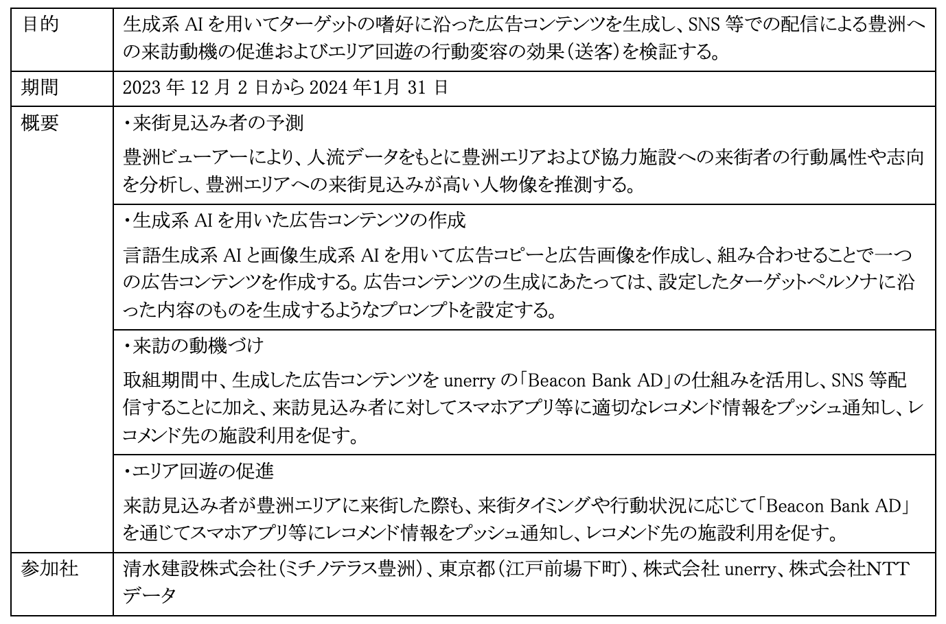 豊洲エリアへの来訪見込みが高い人物像を推測するとともに、来訪者の趣味嗜好、そして場所や時間に沿ったレコメンド情報をunerryの「Beacon Bank AD」を使いリアルタイムにプッシュ配信(※3)することで行動変容を促し、来訪動機の促進や回遊性向上に寄与したかの効果検証を行います。なお、広告配信コンテンツは、ターゲットのペルソナ情報をインプットした上でNTTデータが生成系AIを用いて作成し、コンテンツの作成コスト・時間を短縮する取り組みも実施します(※4)。
