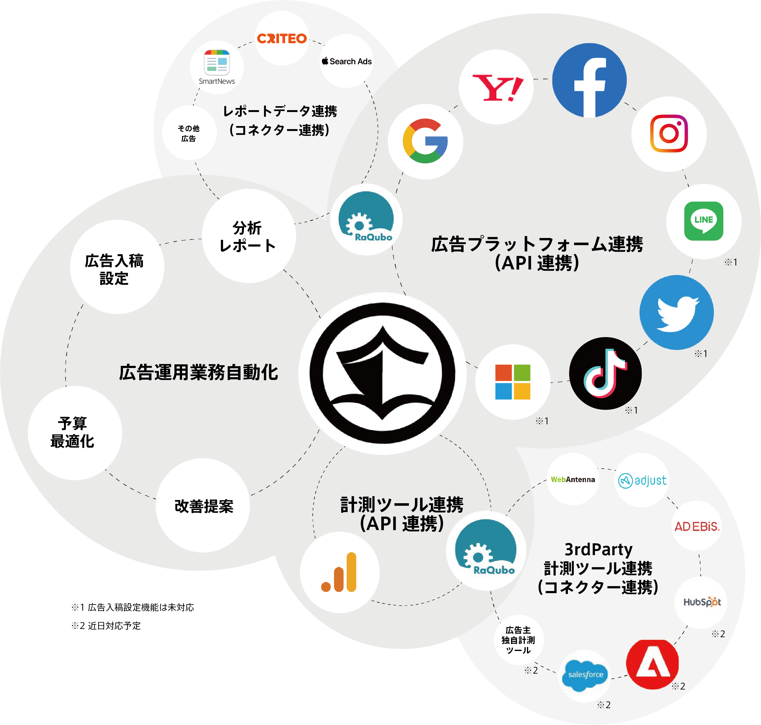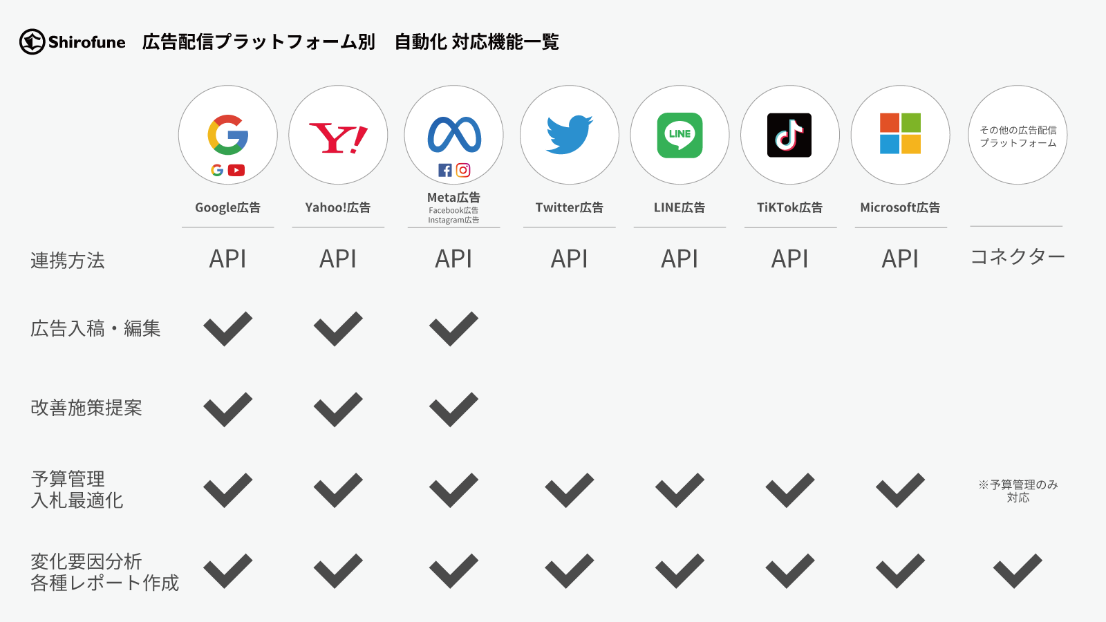 現在13,000を超えるアカウントがShirofuneを通じて運用が自動化されており、上場企業から成長企業の広告主様の自社運用の支援をはじめ、大手広告代理店様の社内運用業務の基幹システムとしての採用など、幅広くご活用頂いております。広告運用のプロのサポートメンバーが、ツールを活用した広告運用の内製化支援を提供しており、生産性高く、かつ再現性が高い運用体制の構築支援も行っています。国内外で唯一のYahoo!広告 API認定パートナーツールです。