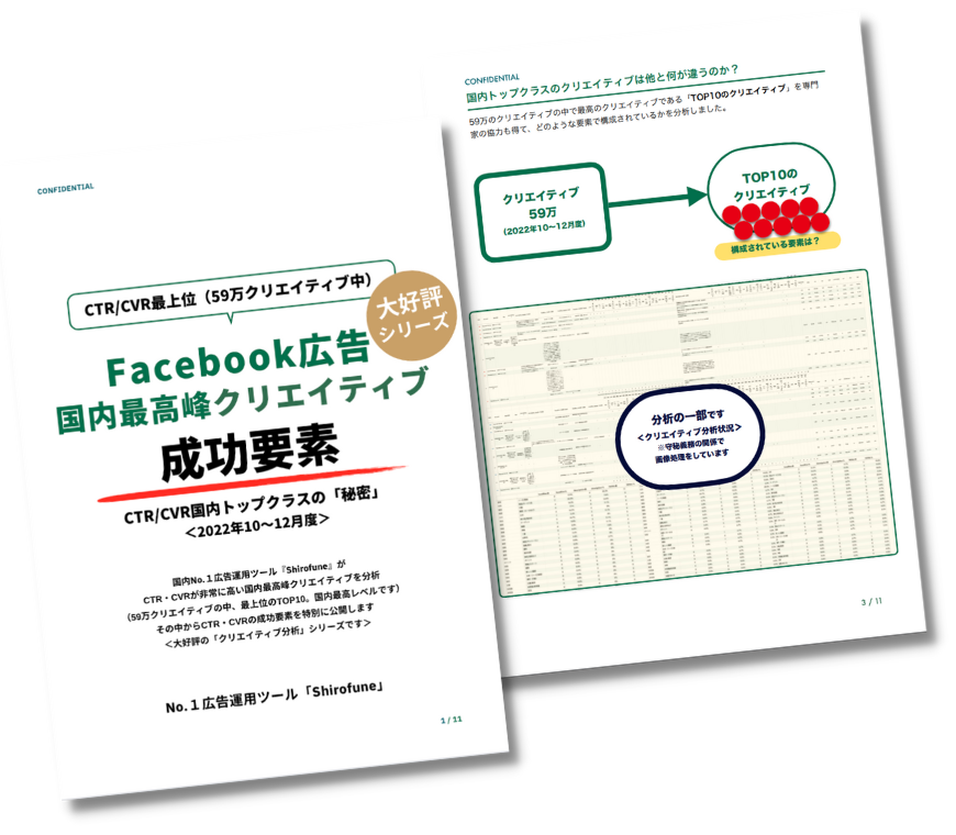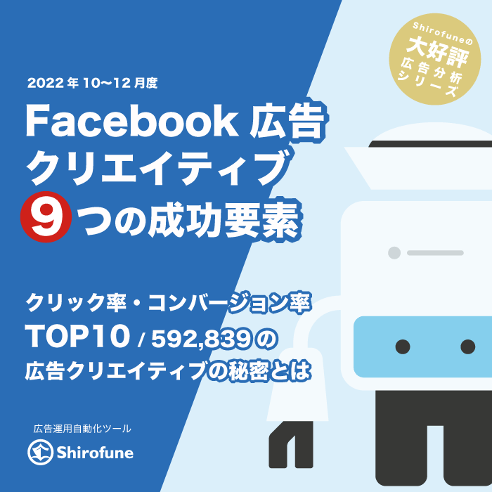 2022年10月から12月の間にShirofuneから配信された約59万件のFacebook広告クリエイティブのうち、TOP10のクリック率やコンバージョン率を記録したクリエイティブを分析。そこに共通する9つの成功要素をレポートにまとめました。