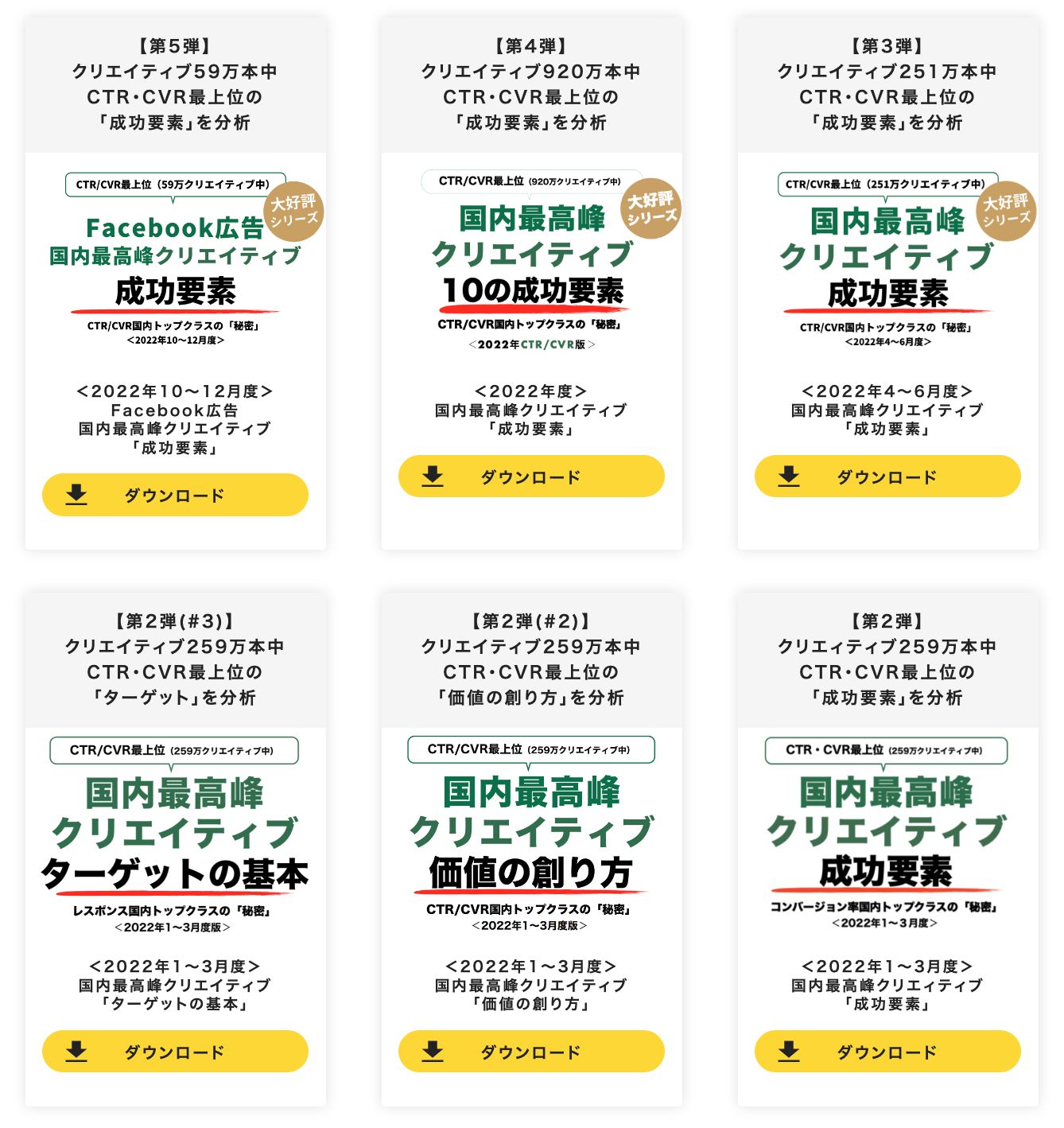 これまで最高峰クリエイティブの分析シリーズとして「成功要素」「価値の作り方」「ターゲットの基本」をテーマに第4弾・全6種類のレポートを公開し、多くの方にダウンロードいただきました。第5弾となる今回、初めてFacebook広告クリエイティブを取り上げます。