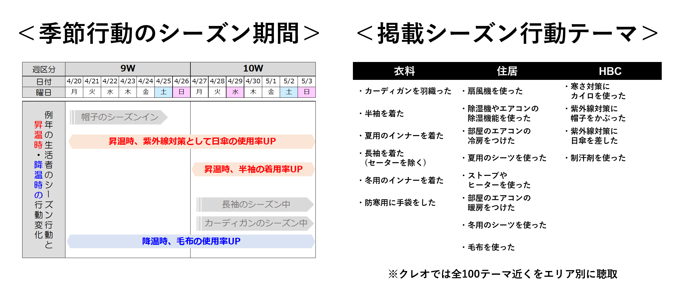 「カレンダー・社会トピックス」「生活者のシーズン行動」「週ごとの販促テーマと注力MD」「売上金額上位MD・年間順位上位MD」までを網羅し、販促企画立案や当月の販売効率向上をサポートします。また、エリア別生活行動実施率(例:東北・九州などのエリア別週次暖房使用率等)データもオプション提供可能で、販促現場の柔軟な情報活用やテンプレート編集・カスタマイズにも最適です。